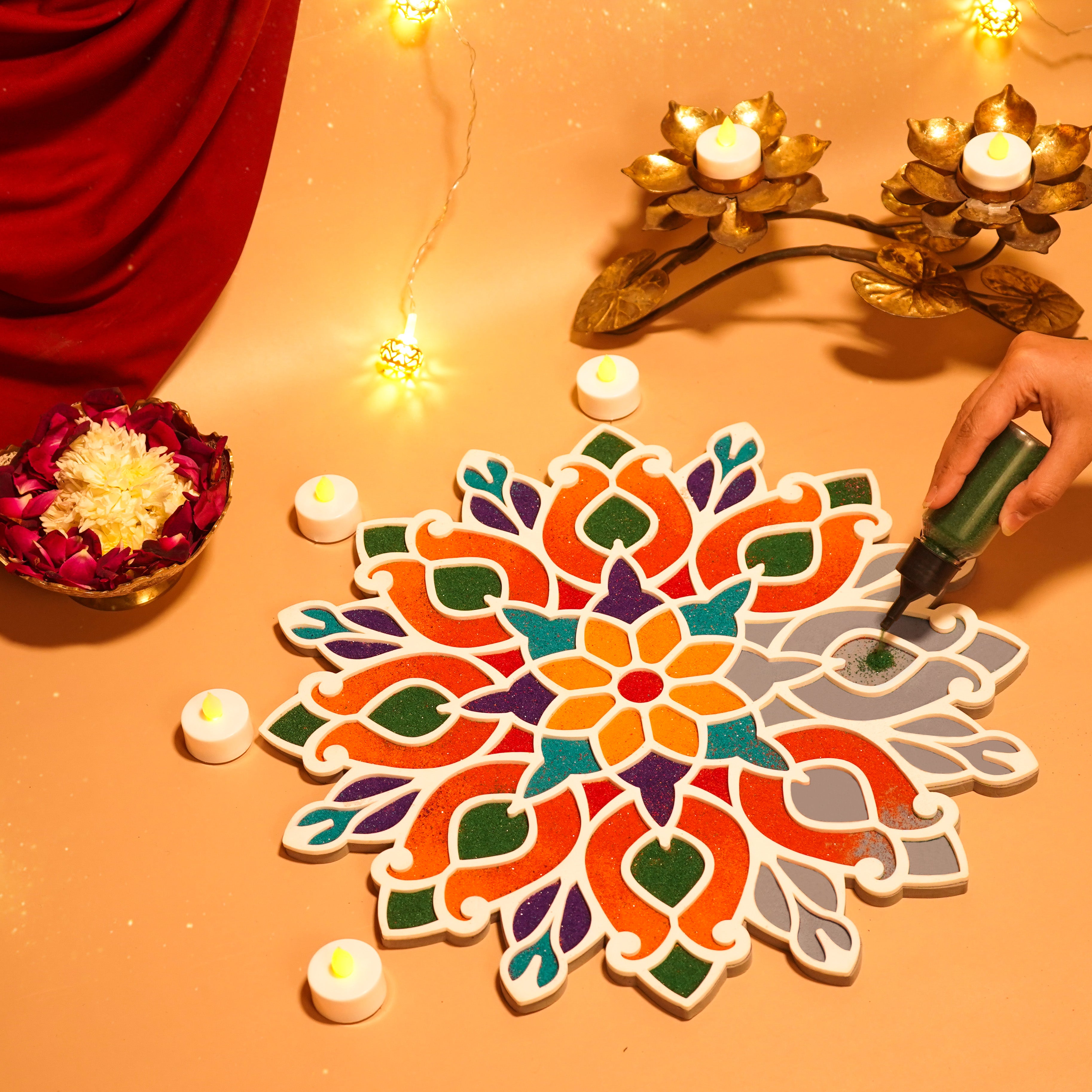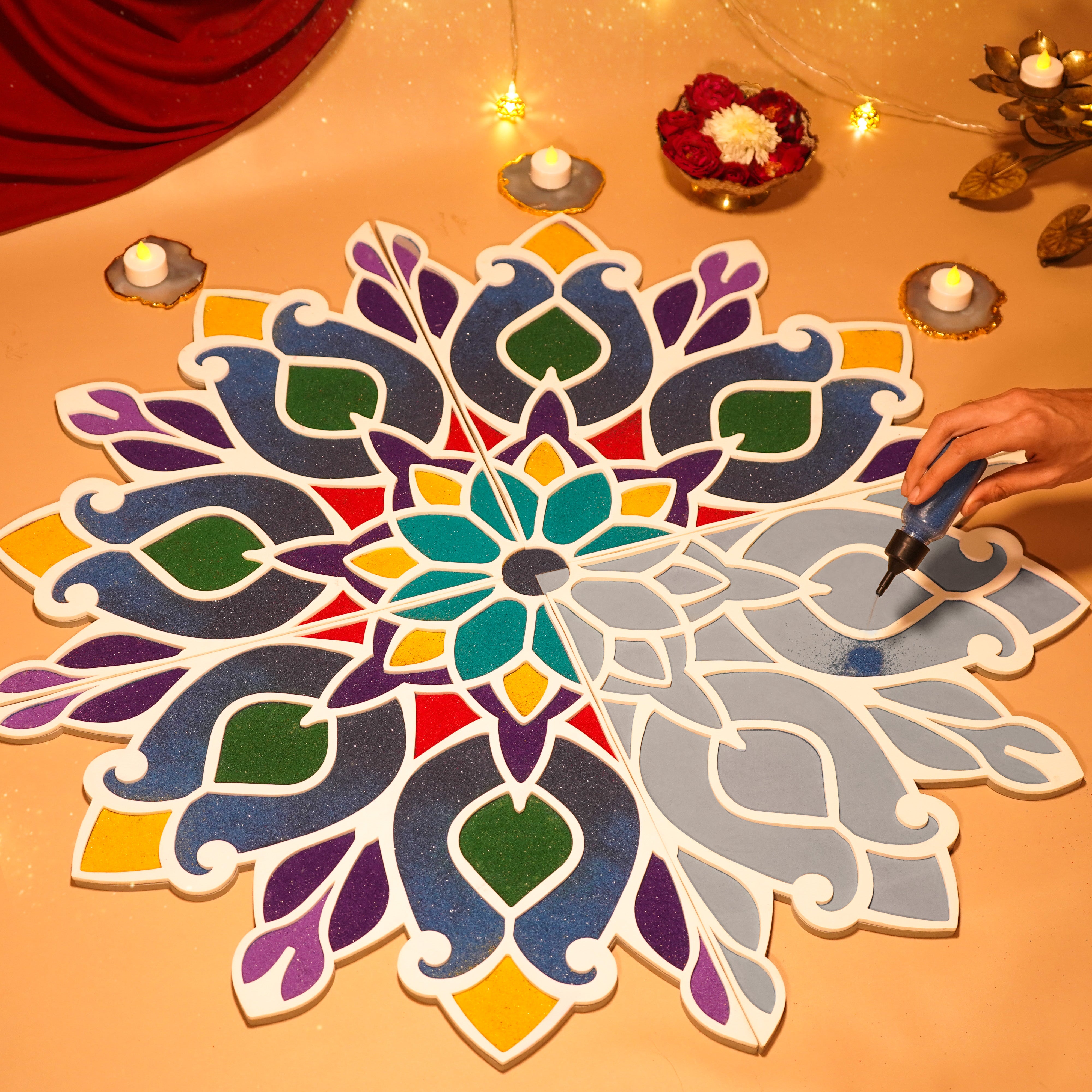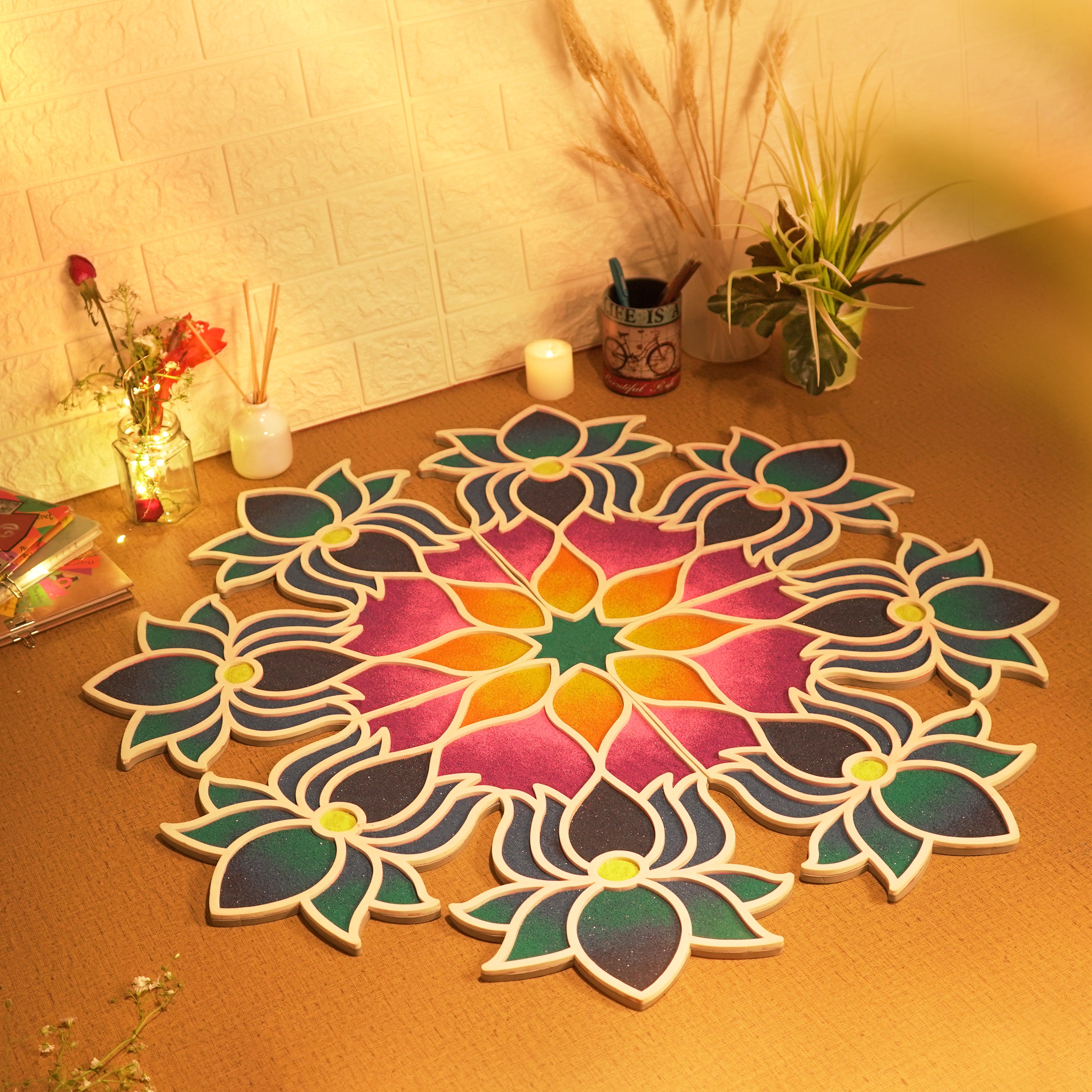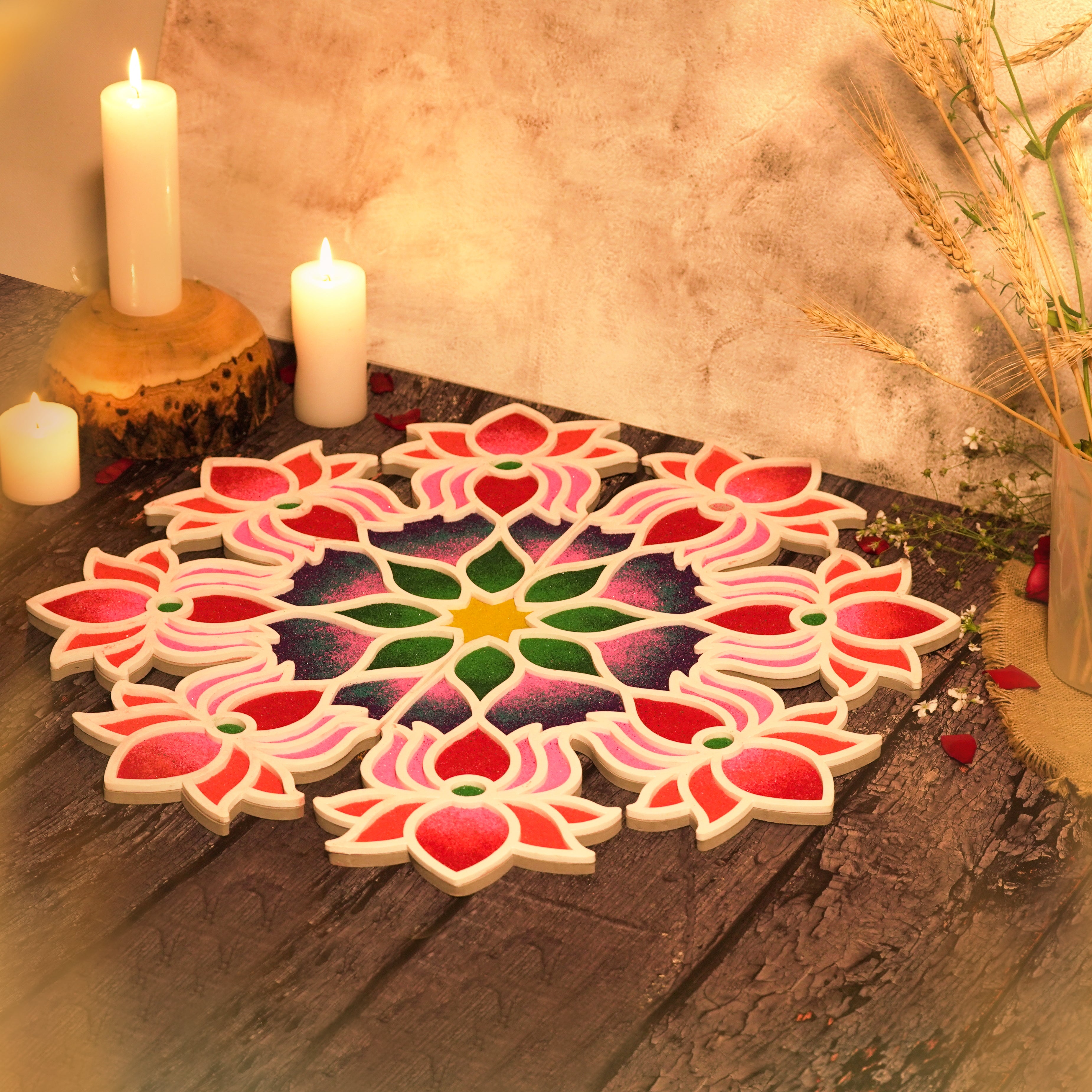 Portable: The template allows the everyone to fill rangoli in their comfort space and then place it on your desired space.Lightweight & Easy to clean:Island Rangoli can be placed anywhere and on any surface like floor, furniture, water, walls and garden. It can be washed easily OR you can dry dust Using Spade spoon` and brush to remove previous fillings and make it ready for next use and Storage.Easy to make: Island Rangolis allows you in making a hassle and mess-free rangoli. Make it wherever and whenever you want in your comfort zone, without having to flesh out countless hours.Placements: Place the template at the desired space of your home/office such floor, garden, table top, stairs etc. Decorate with your Preferential ingredients like Colors, Pulses, Flowers, acrylic colours or SpicesCan be Floated: Island Rangoli is first kind of rangoli in the world that can be floated on water which eventually enhances the beautification of this art. Adorn your space with this rangoli and seek compliments from your loved ones