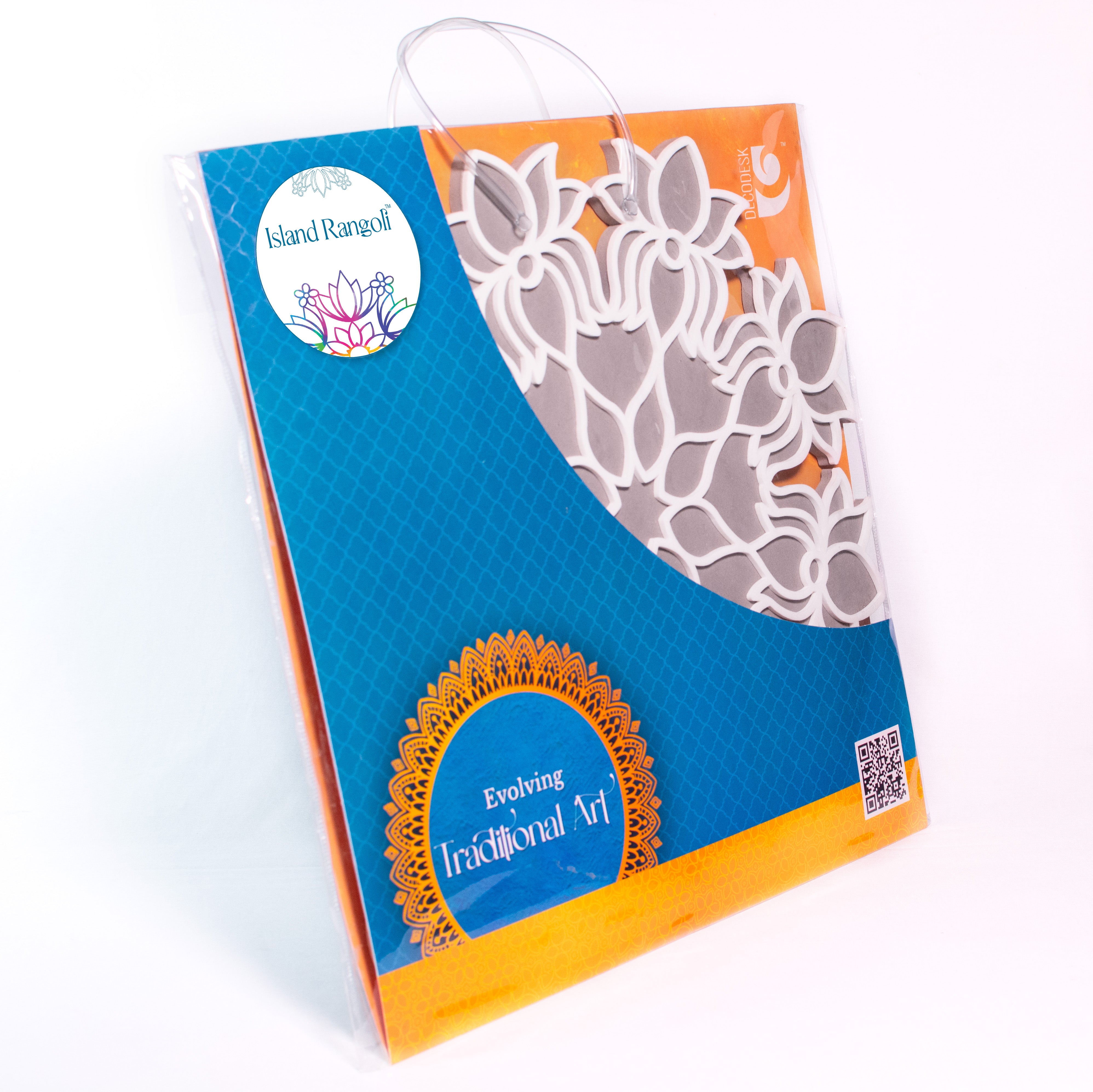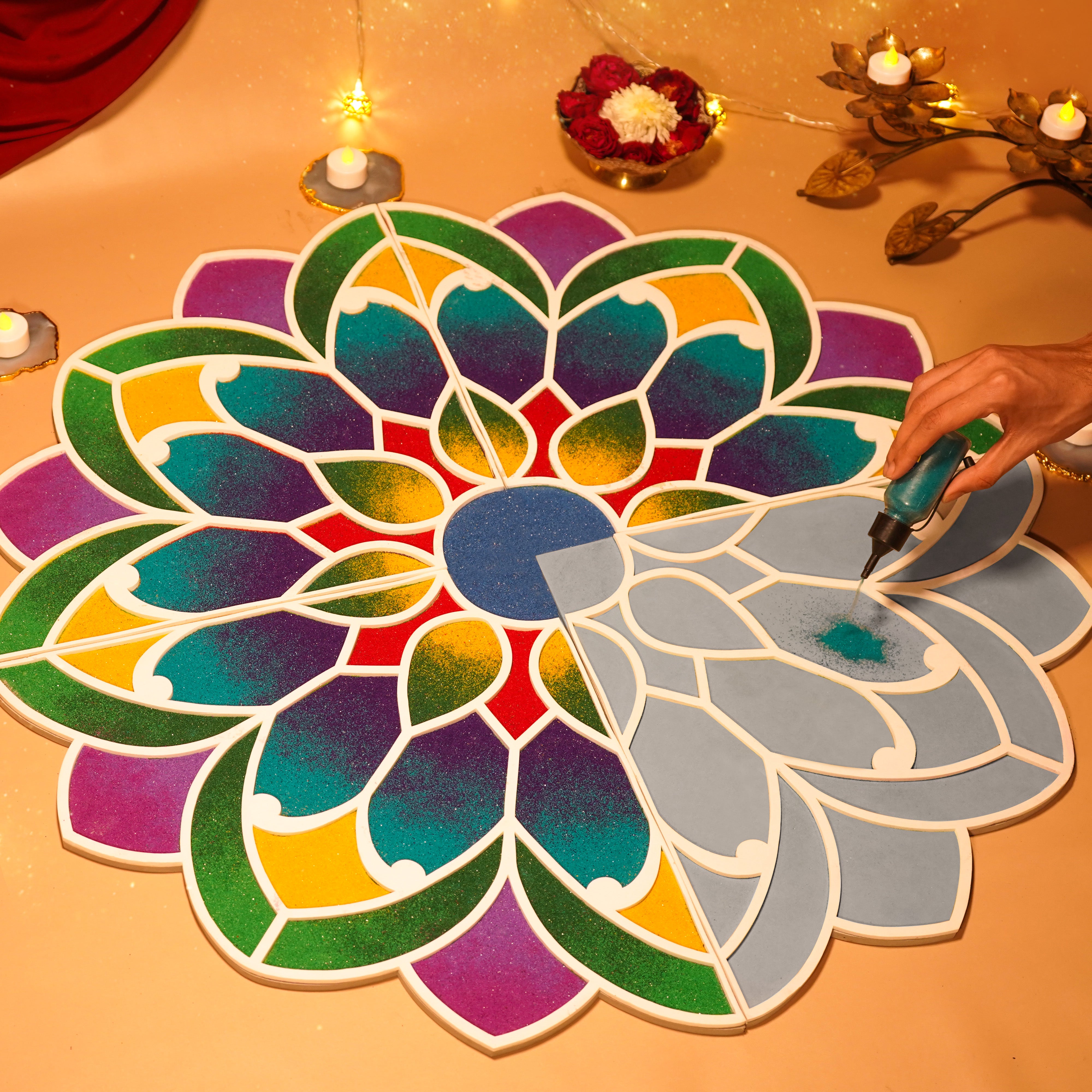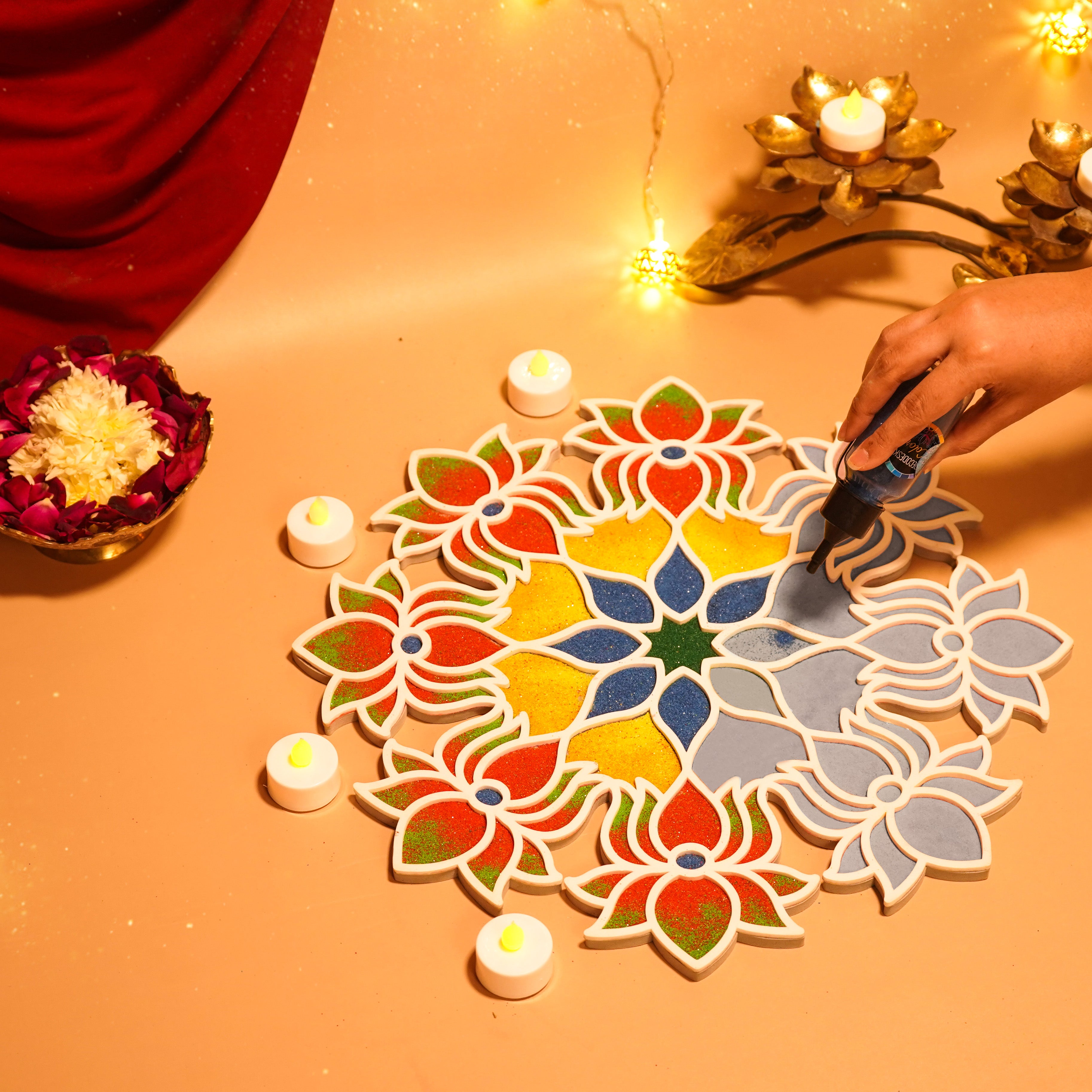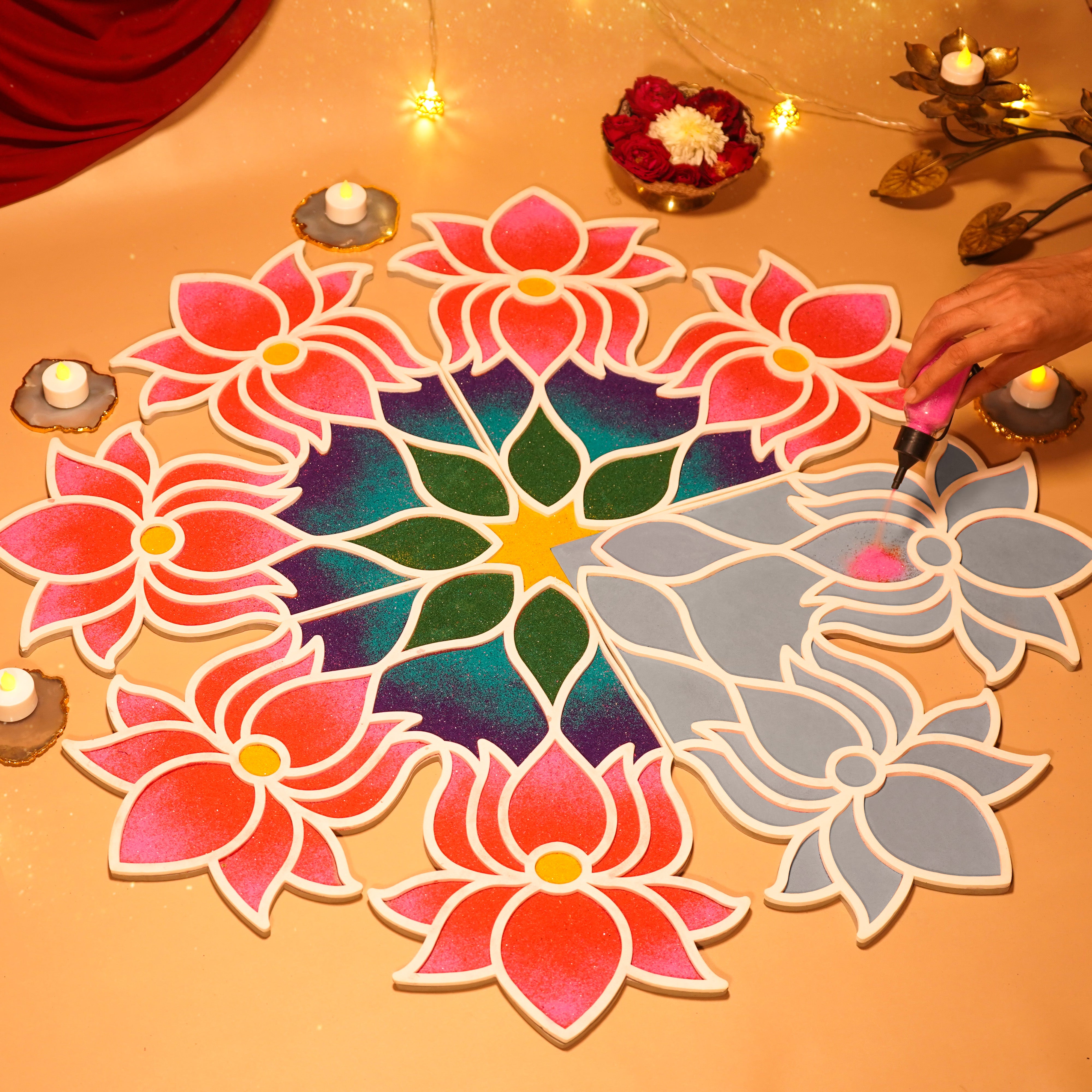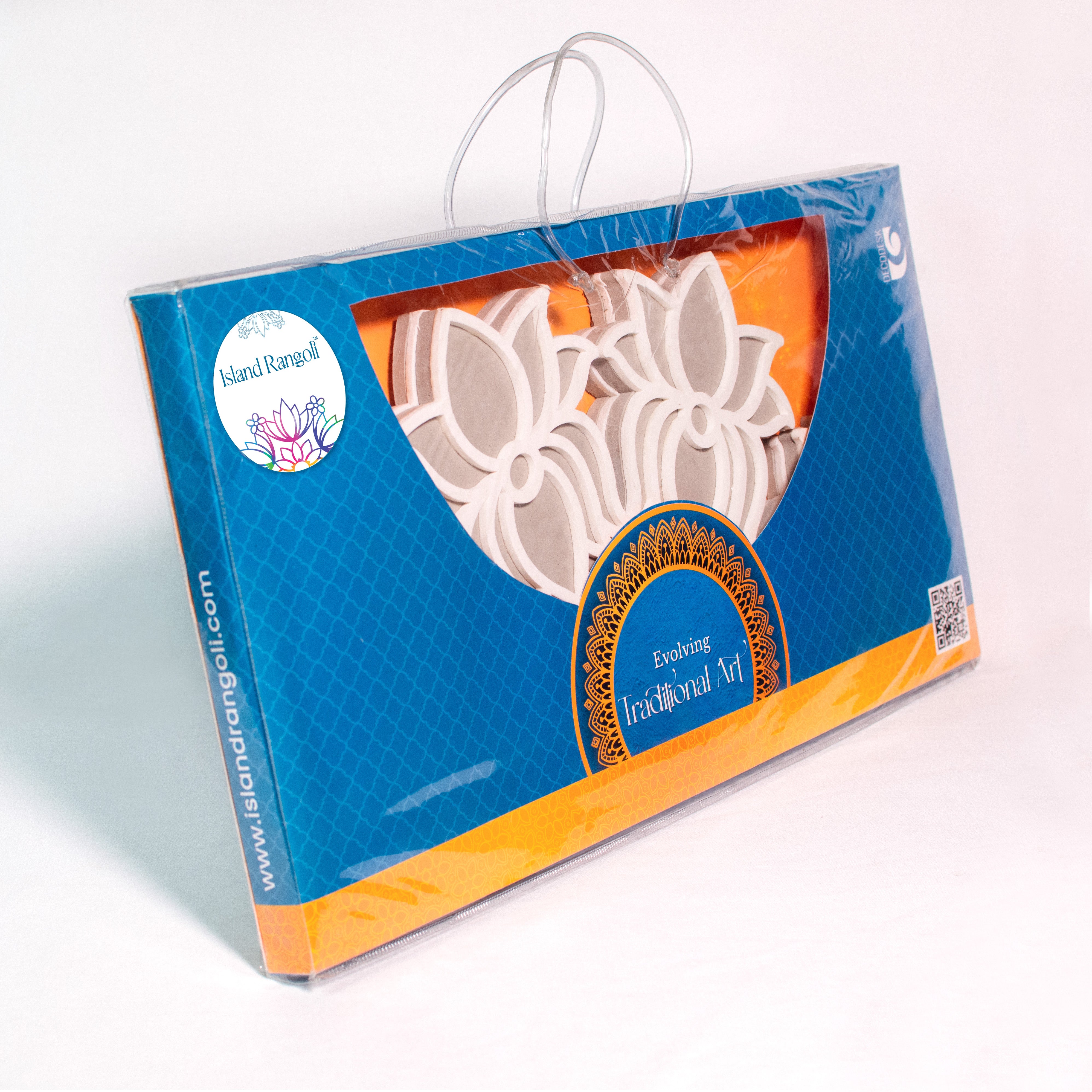 Portable: The template allows the everyone to fill rangoli in their comfort space and then place it on your desired space.Lightweight & Easy to clean:Island Rangoli can be placed anywhere and on any surface like floor, furniture, water, walls and garden. It can be washed easily OR you can dry dust Using Spade spoon` and brush to remove previous fillings and make it ready for next use and Storage.Easy to make: Island Rangolis allows you in making a hassle and mess-free rangoli. Make it wherever and whenever you want in your comfort zone, without having to flesh out countless hours.Placements: Place the template at the desired space of your home/office such floor, garden, table top, stairs etc. Decorate with your Preferential ingredients like Colors, Pulses, Flowers, acrylic colours or SpicesCan be Floated: Island Rangoli is first kind of rangoli in the world that can be floated on water which eventually enhances the beautification of this art. Adorn your space with this rangoli and seek compliments from your loved ones