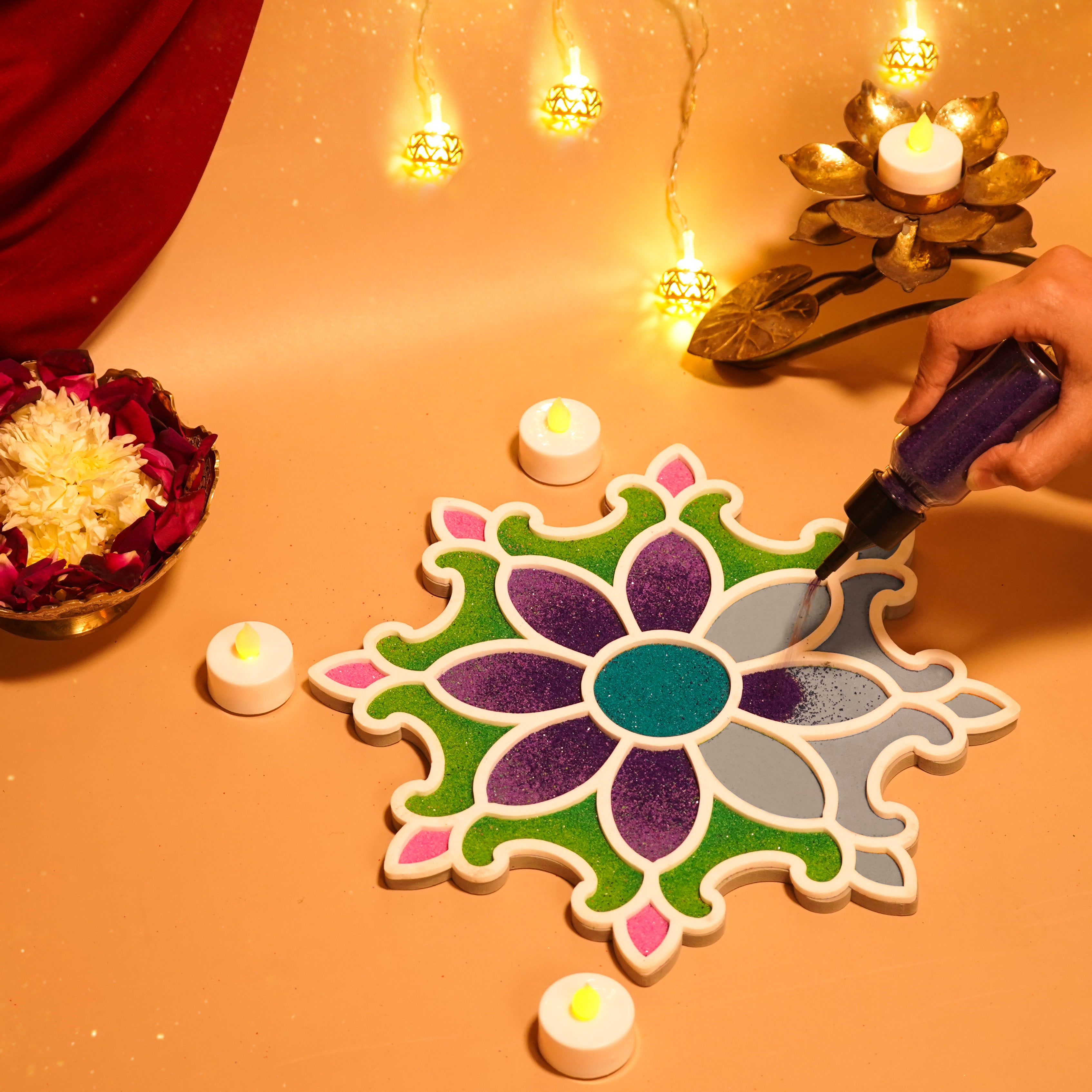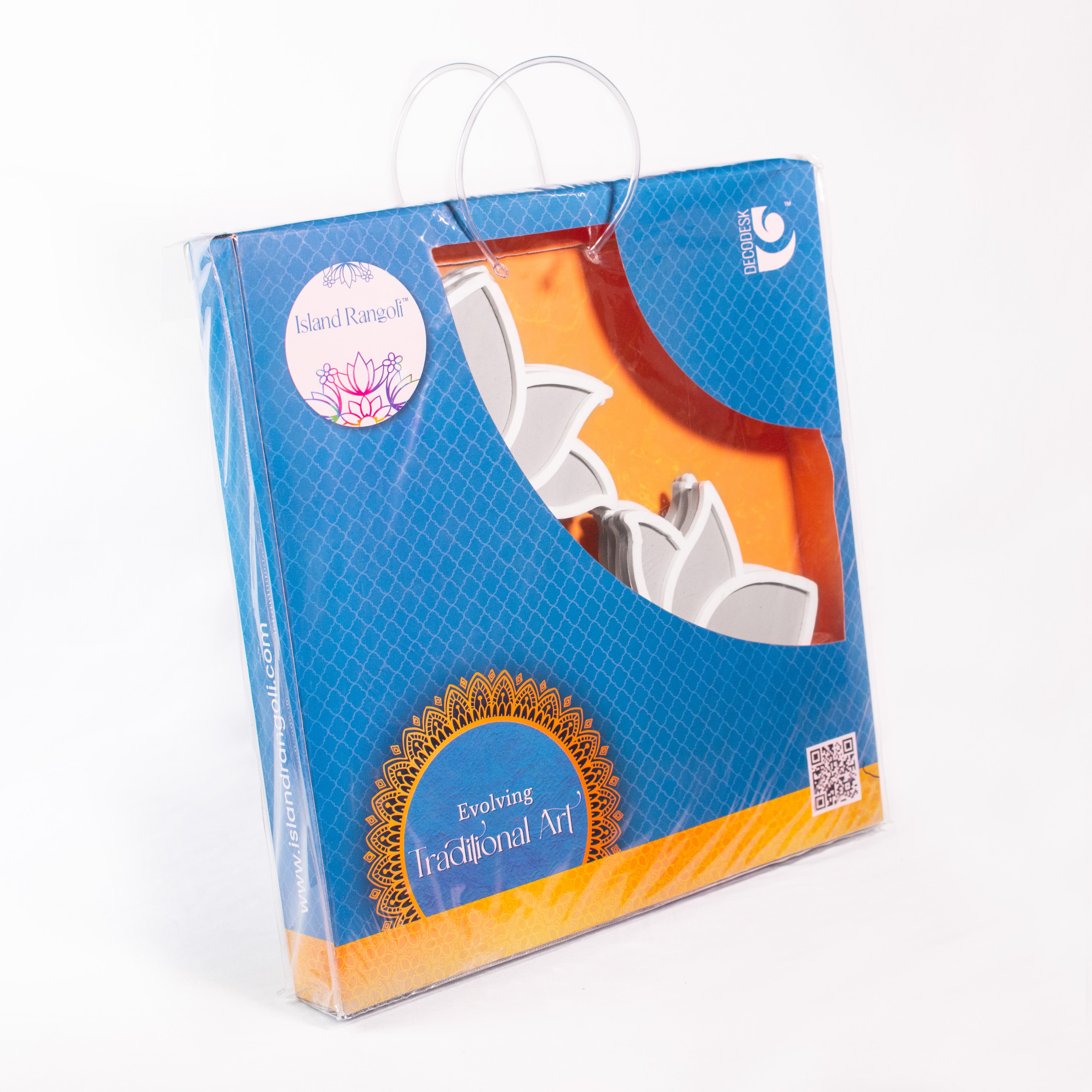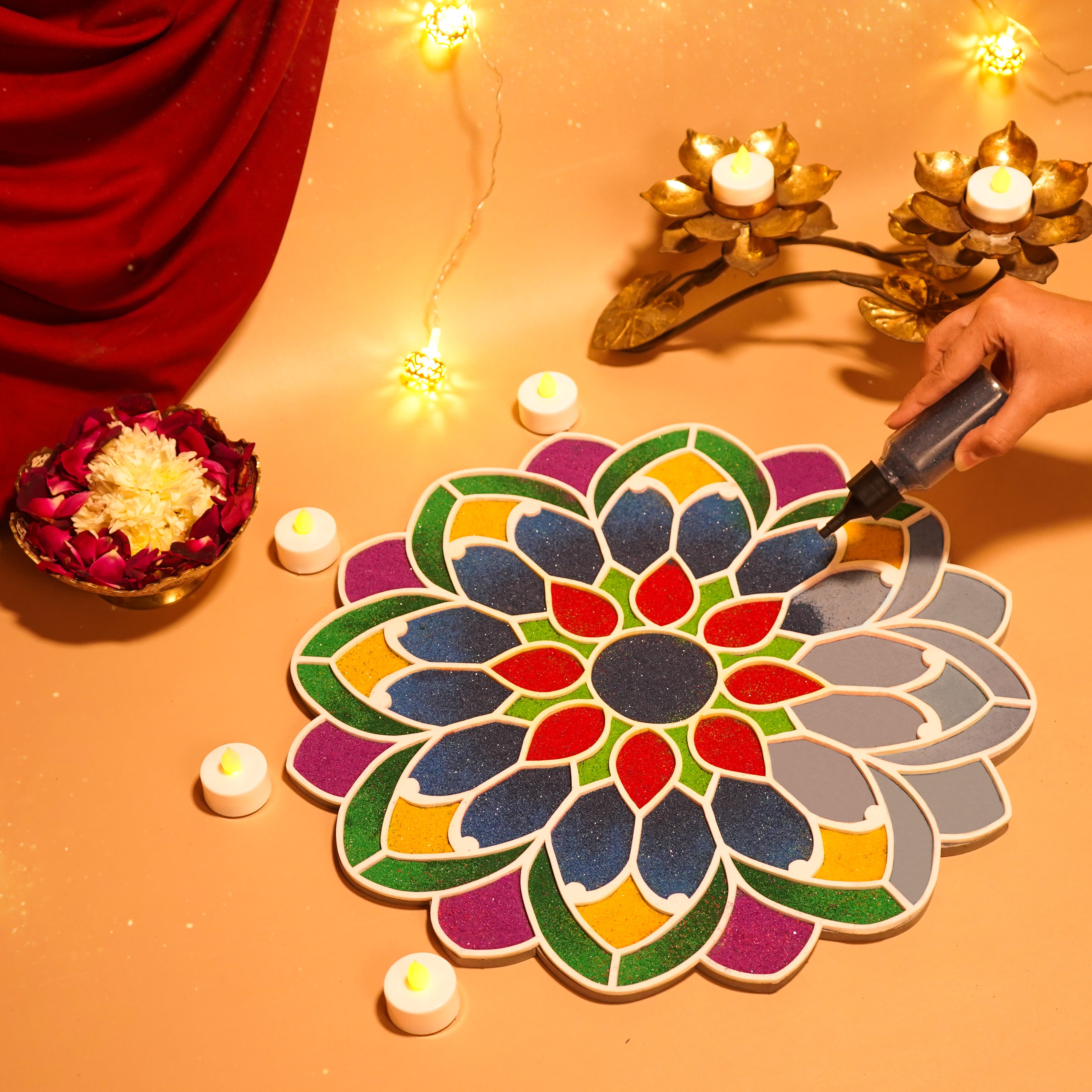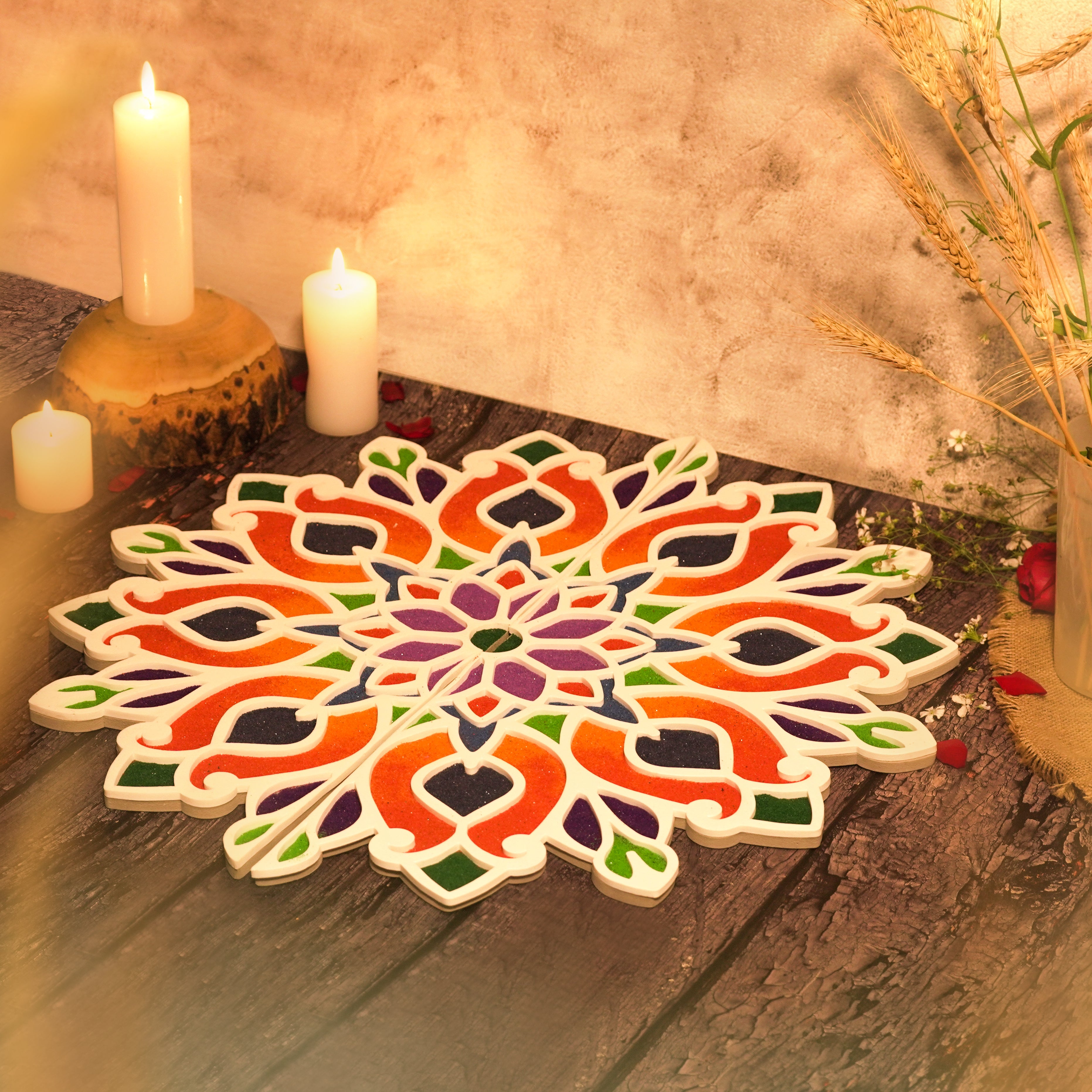Portable: The template allows the everyone to fill rangoli in their comfort space and then place it on your desired space.Lightweight & Easy to clean:Island Rangoli can be placed anywhere and on any surface like floor, furniture, water, walls and garden. It can be washed easily OR you can dry dust Using Spade spoon` and brush to remove previous fillings and make it ready for next use and Storage.Easy to make: Island Rangolis allows you in making a hassle and mess-free rangoli. Make it wherever and whenever you want in your comfort zone, without having to flesh out countless hours.Placements: Place the template at the desired space of your home/office such floor, garden, table top, stairs etc. Decorate with your Preferential ingredients like Colors, Pulses, Flowers, acrylic colours or SpicesCan be Floated: Island Rangoli is first kind of rangoli in the world that can be floated on water which eventually enhances the beautification of this art. Adorn your space with this rangoli and seek compliments from your loved ones