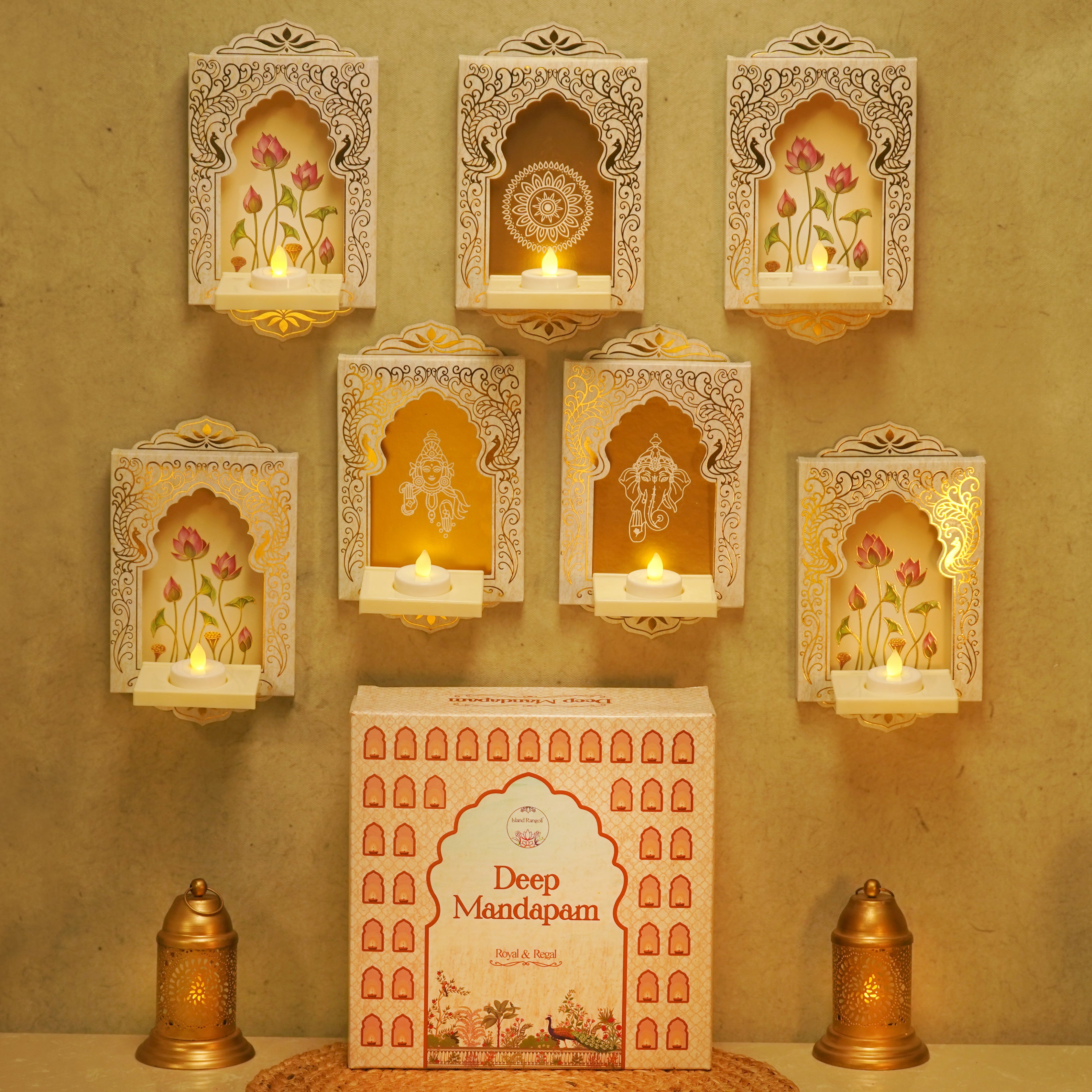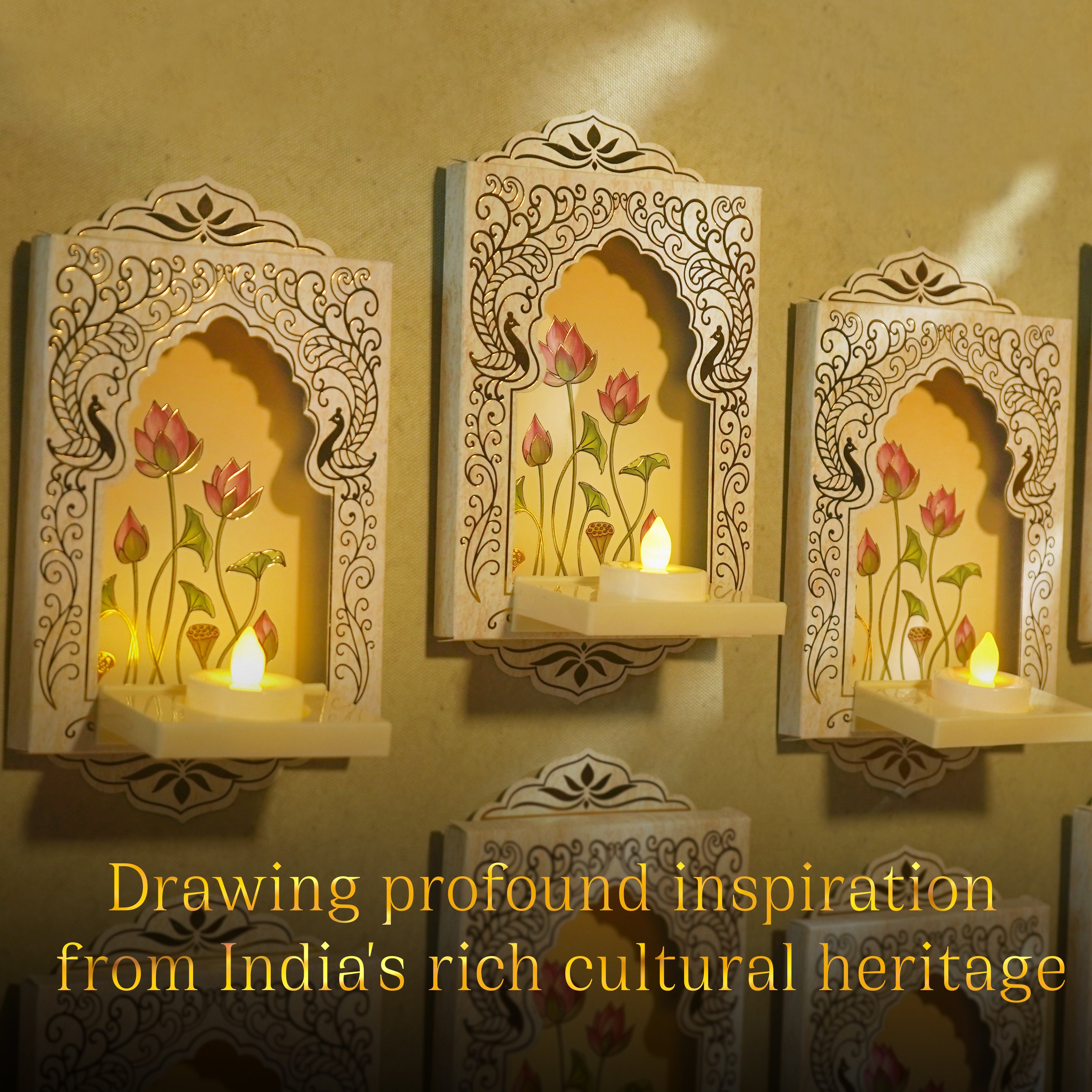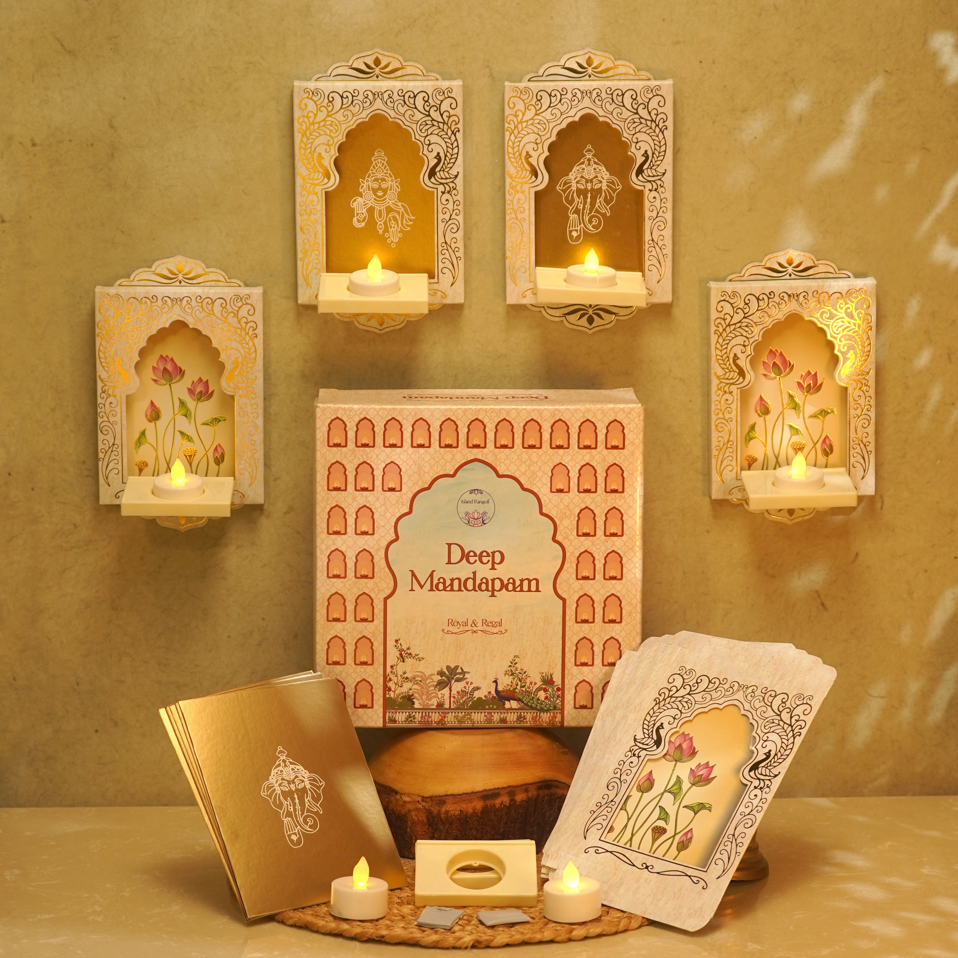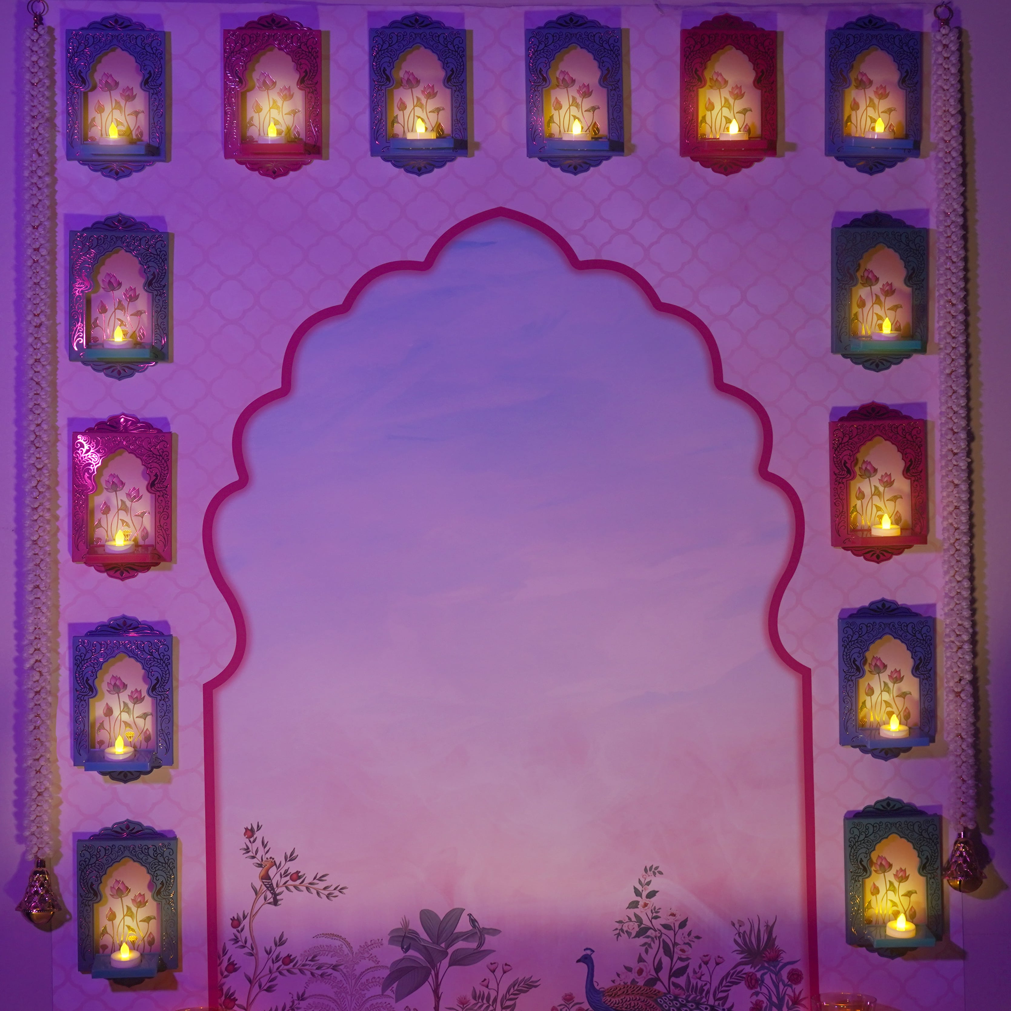 Taking the legacy forward of Deep Dwar, Introducing DEEP MANDAPAM - crafted to bring an air of vintage royalty to your space, These wall Jharokhas comes with beautiful golden sliders that lets you switch up your backdrop effortlessly for different decor moods.. This compact size jharokhas are perfect addition to your festive decor offering versatile charm for walls, door entrances, lobbies, staircases, and balconies. Affix with ease using our residue-free, reusable glue and give your walls a glow of timeless craftsmanship. Compact and thoughtfully designed, Deep Mandapam Jharokha Boxes make for the perfect gifting