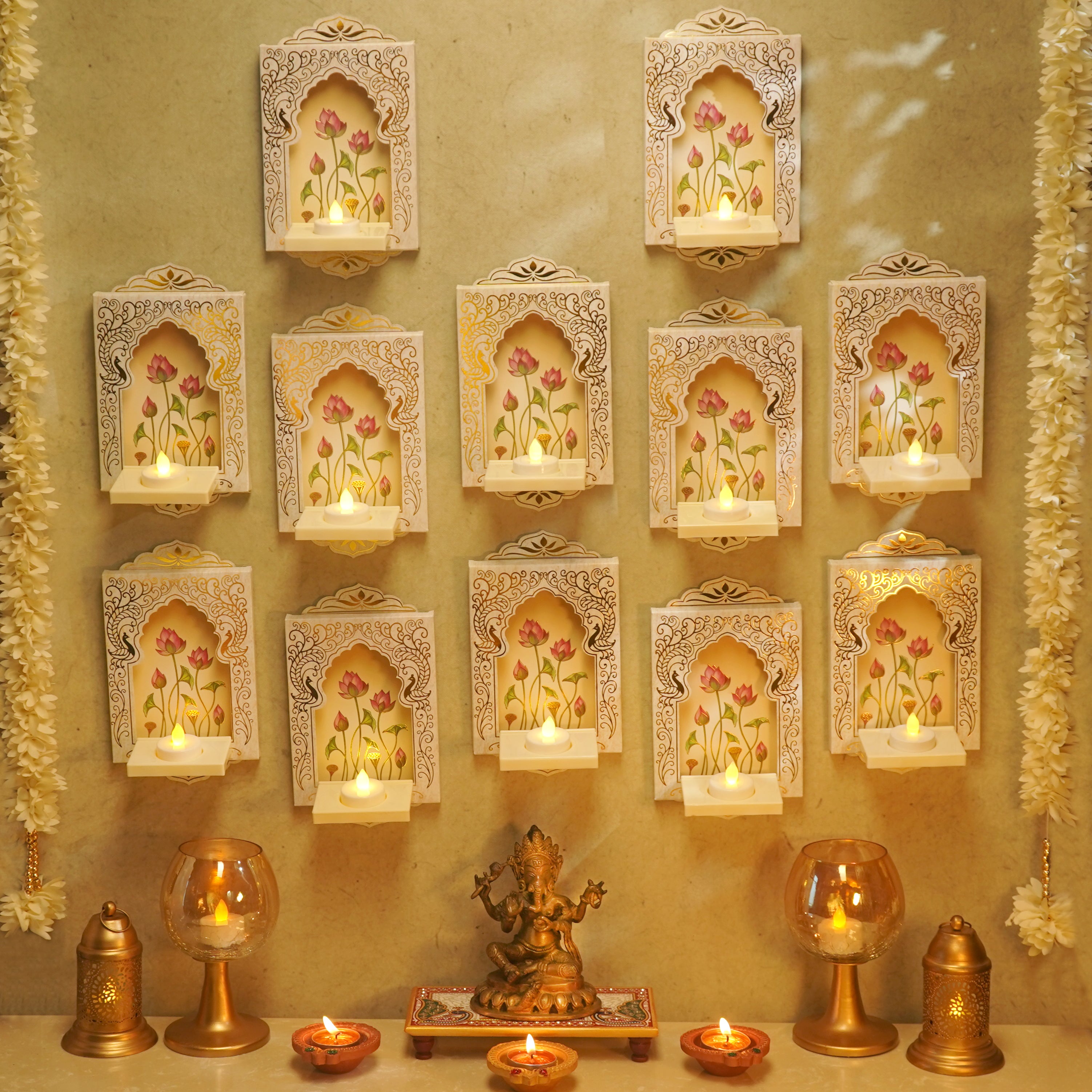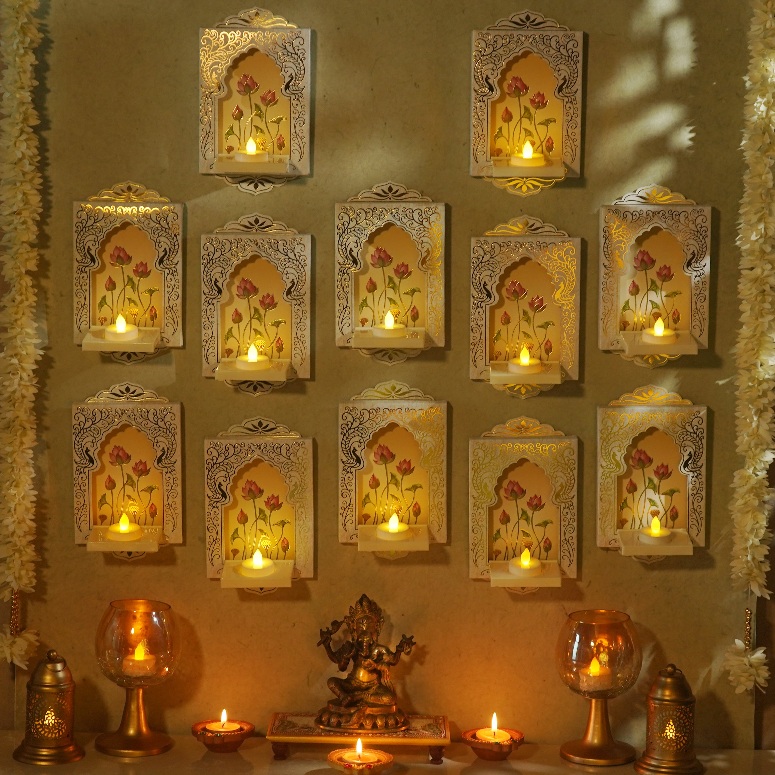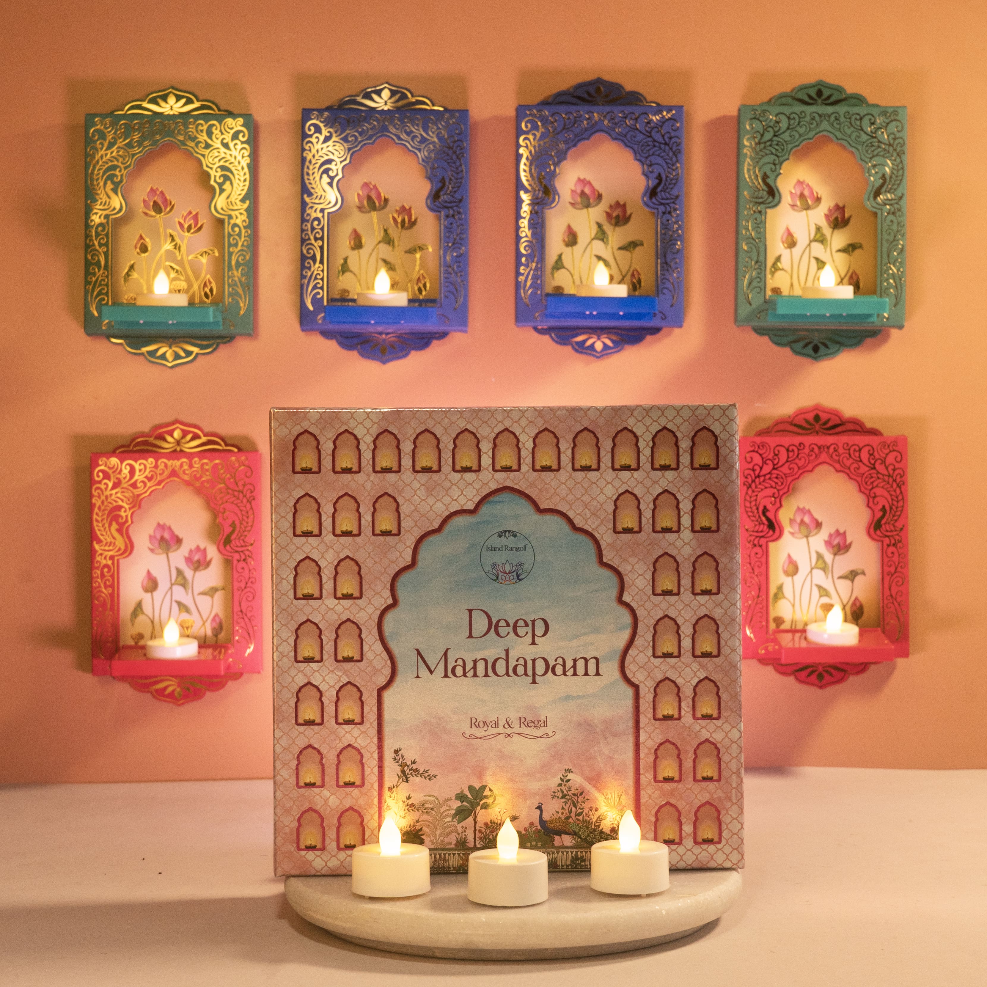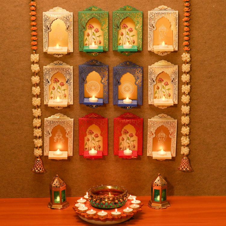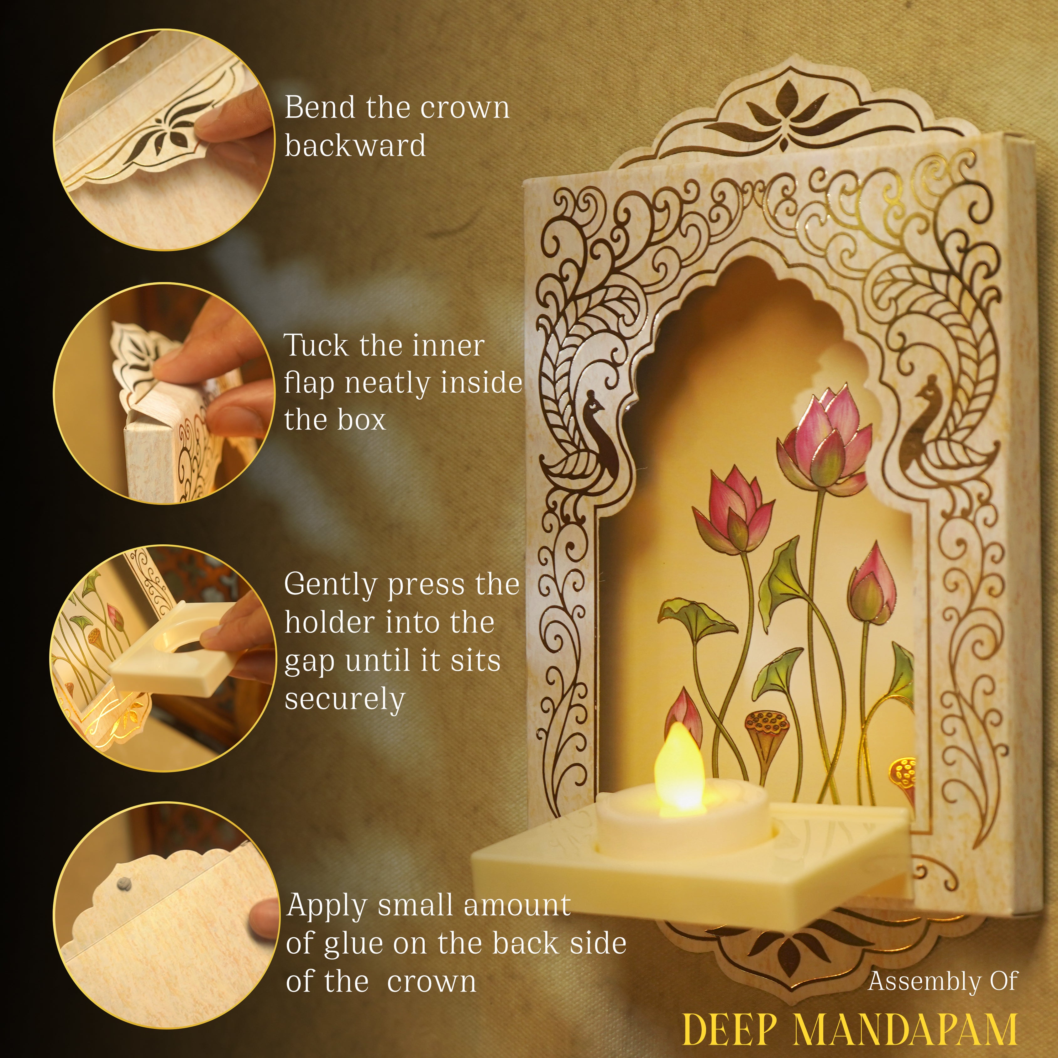 Taking the legacy forward of Deep Dwar, Introducing DEEP MANDAPAM - crafted to bring an air of vintage royalty to your space, These wall Jharokhas comes with beautiful golden sliders that lets you switch up your backdrop effortlessly for different decor moods.. This compact size jharokhas are perfect addition to your festive decor offering versatile charm for walls, door entrances, lobbies, staircases, and balconies. Affix with ease using our residue-free, reusable glue and give your walls a glow of timeless craftsmanship. Compact and thoughtfully designed, Deep Mandapam Jharokha Boxes make for the perfect gifting