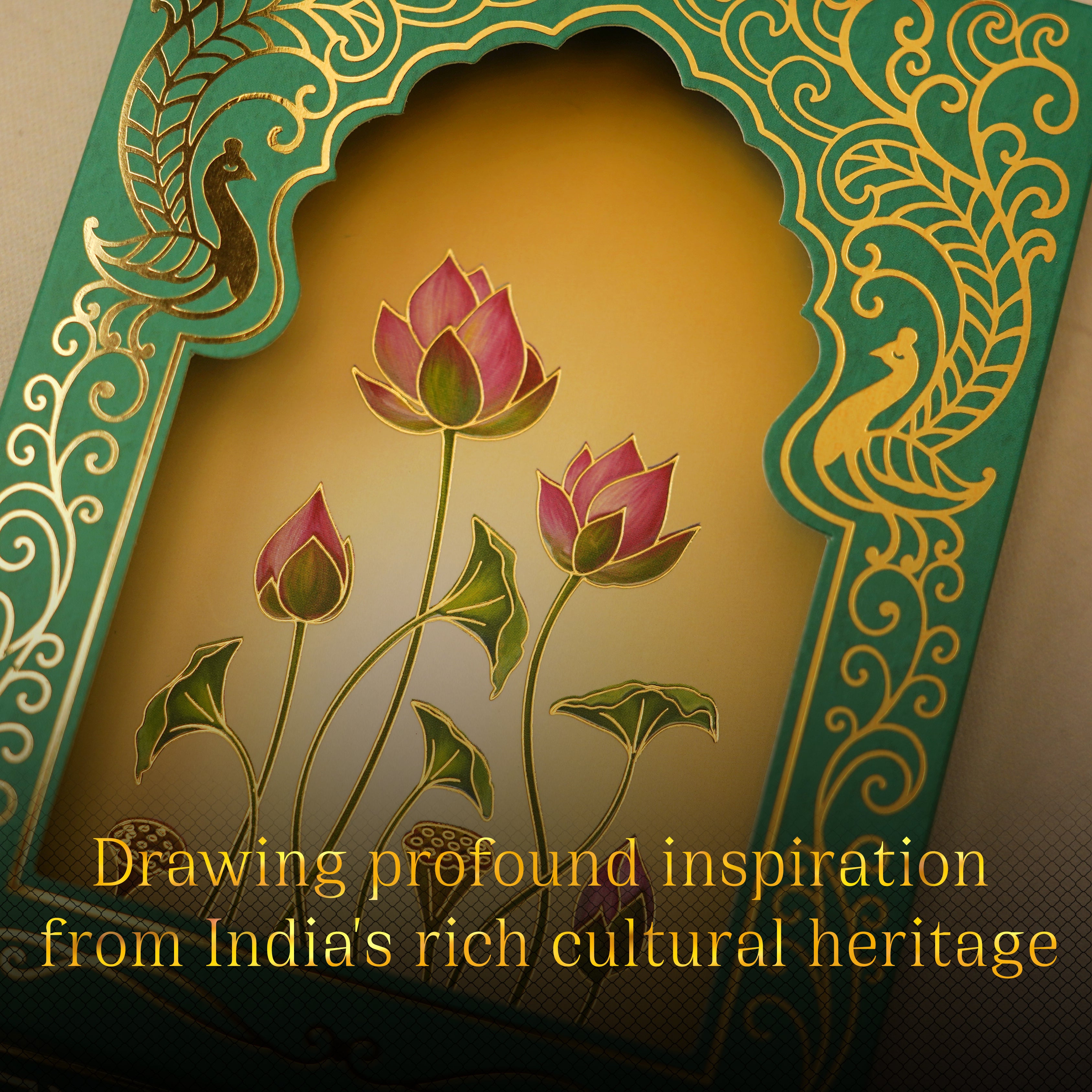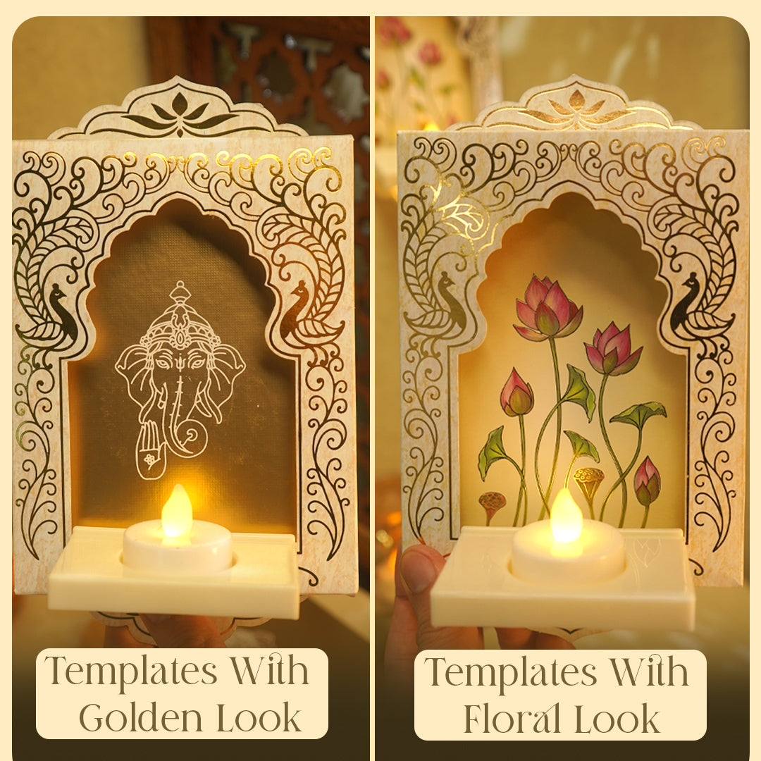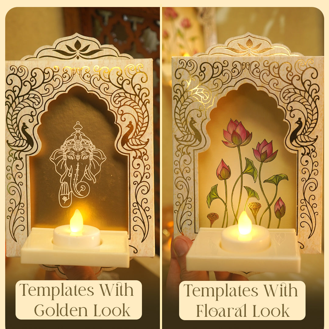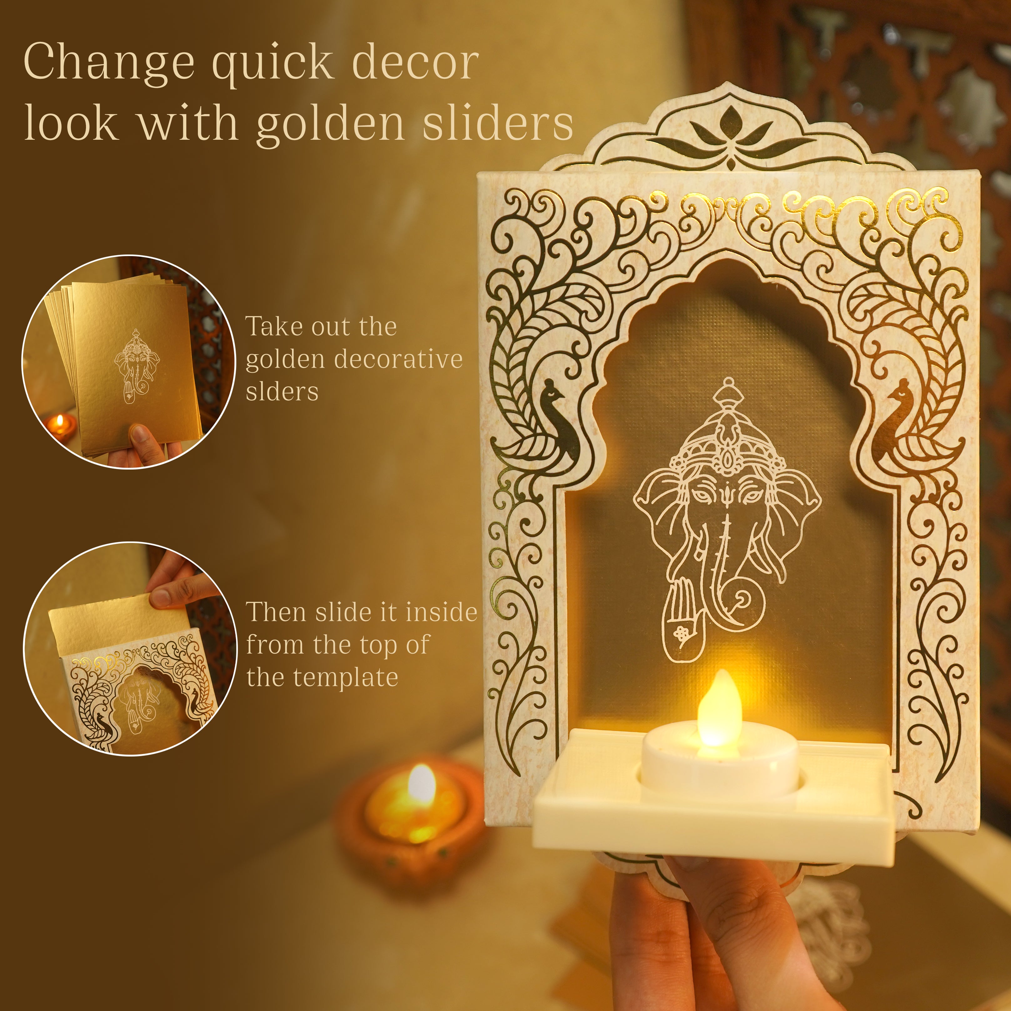 We have included golden decorative sliders that can easily slide in the box. With mandala patterns on one side and traditional Indian icons on the other, they let you switch up your backdrop effortlessly for different decor moods.