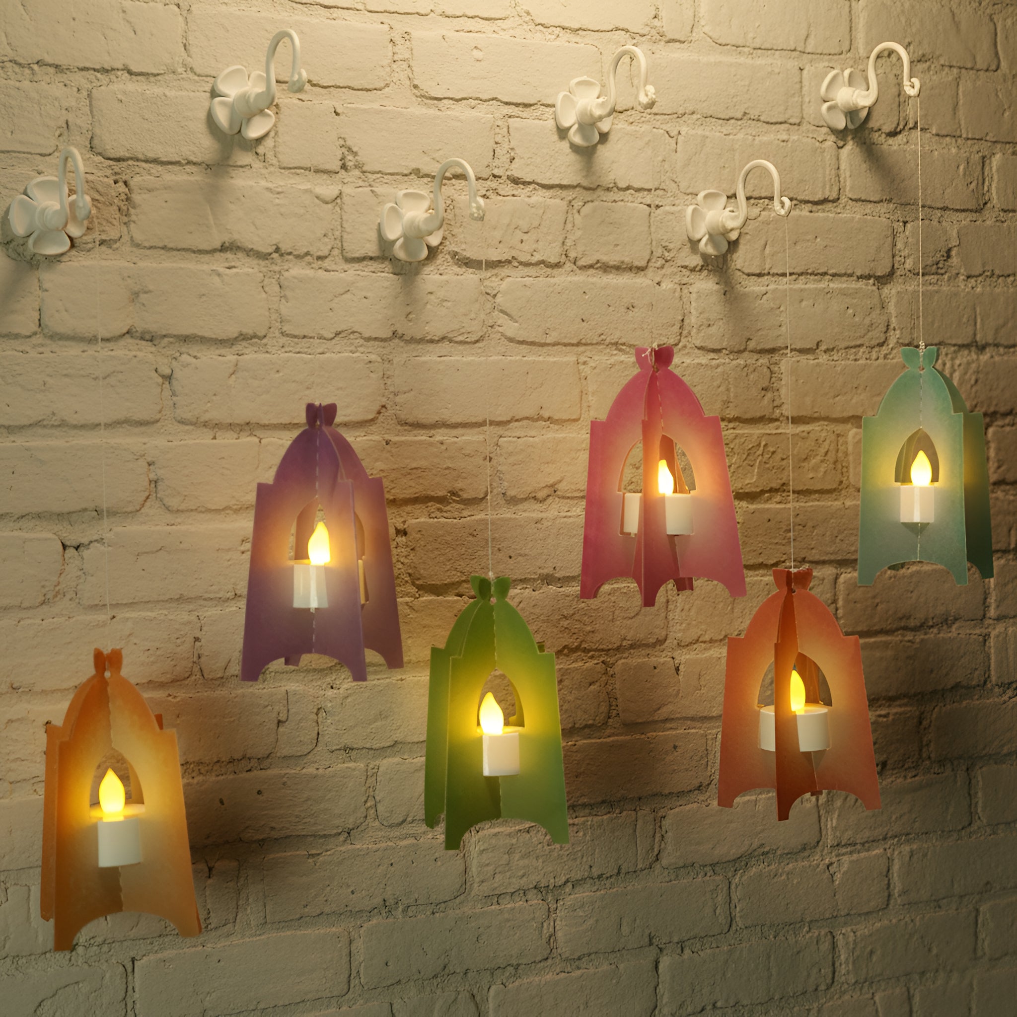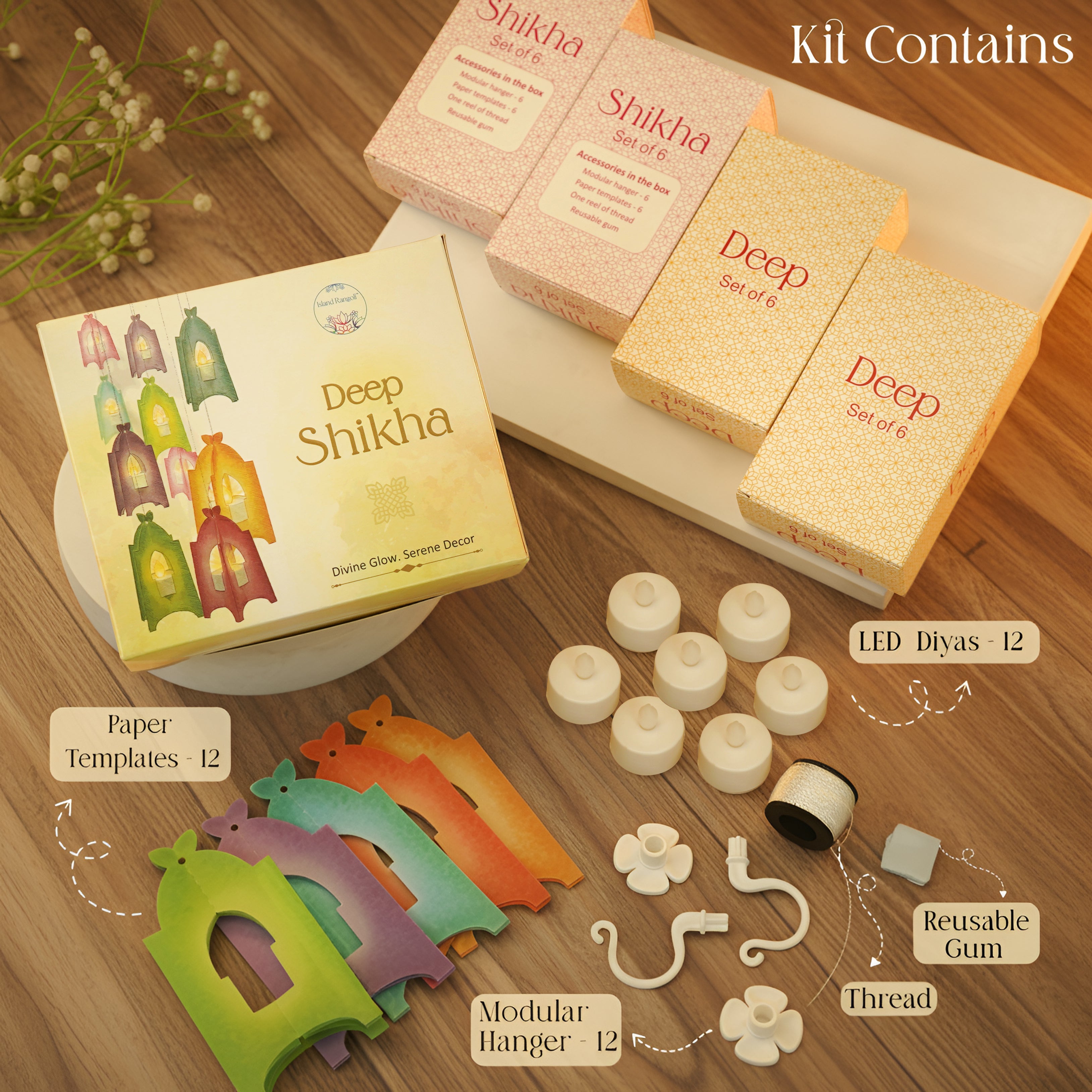 • Set of 12 includes: 12 Deep Shikha Templates with 12 LED Diyas , 12 Modular Hanger, 1 Thread & Reusable Gum.