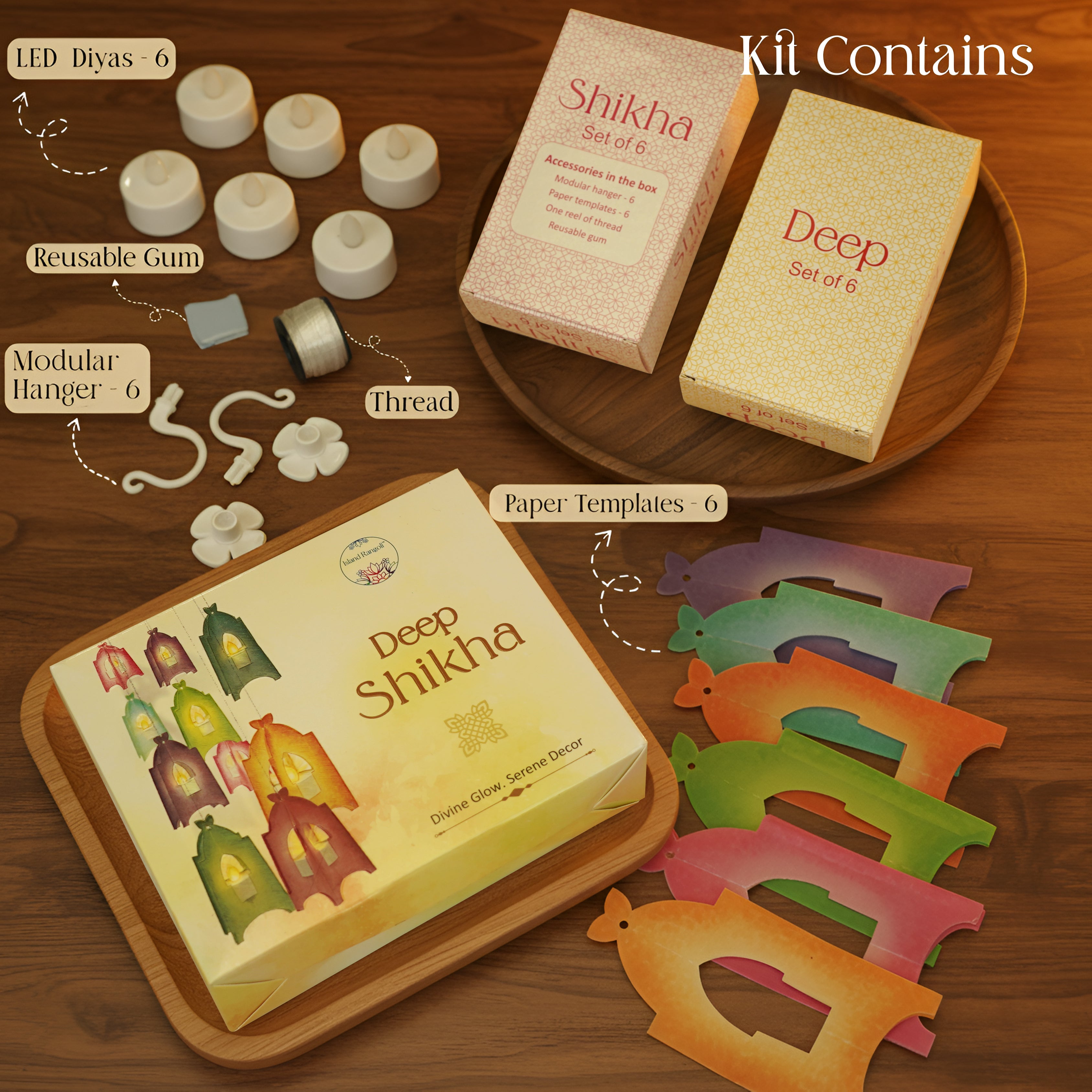 • Set of 6 includes : 6 Deep Shikha Templates with 6 LED Diyas , 6 Modular Hanger, 1 Thread & Reusable Gum.