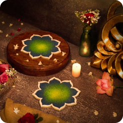 Each set comes with a thoughtfully curated rangoli template made from premium polymer, ready to be filled with colours, petals, or other décor elements.