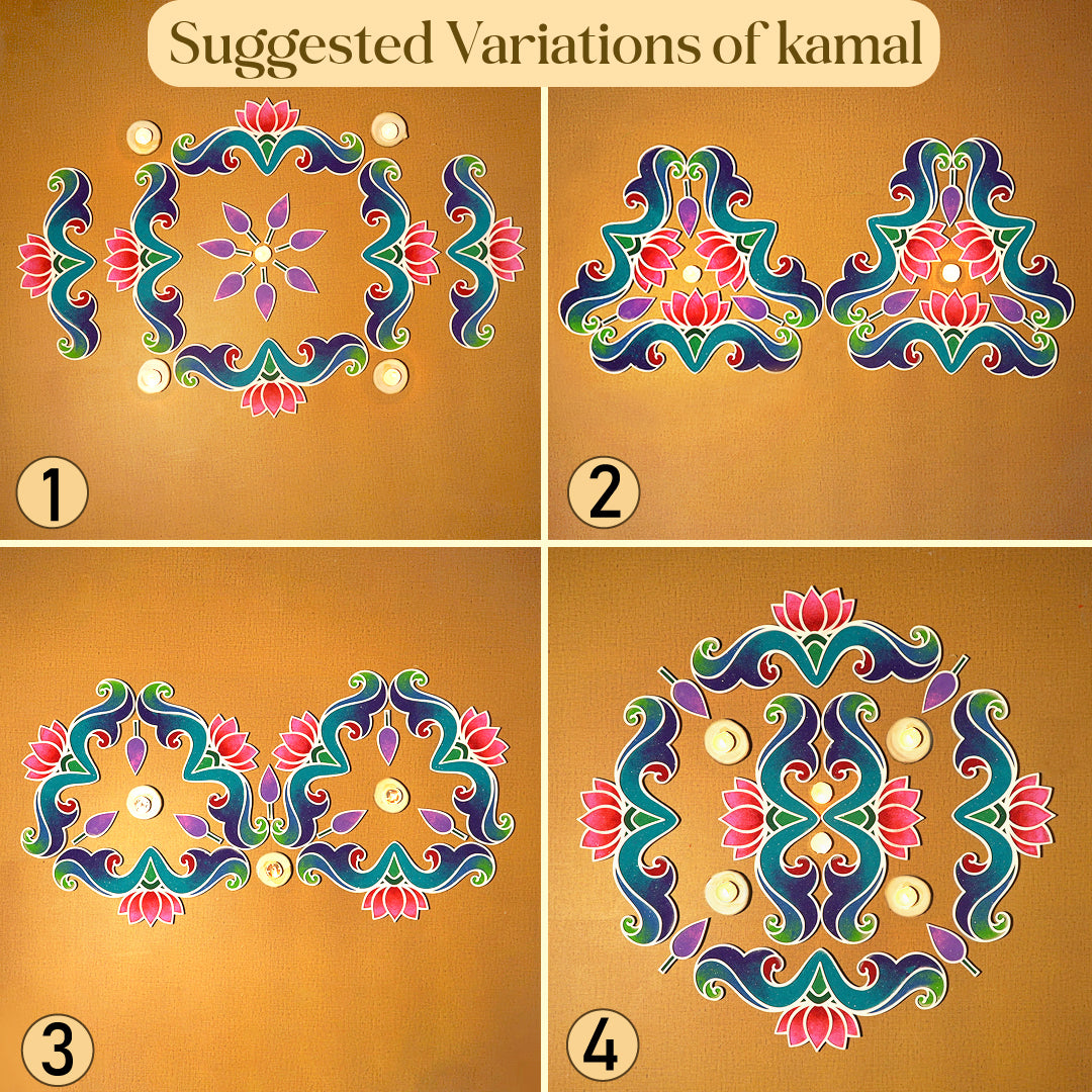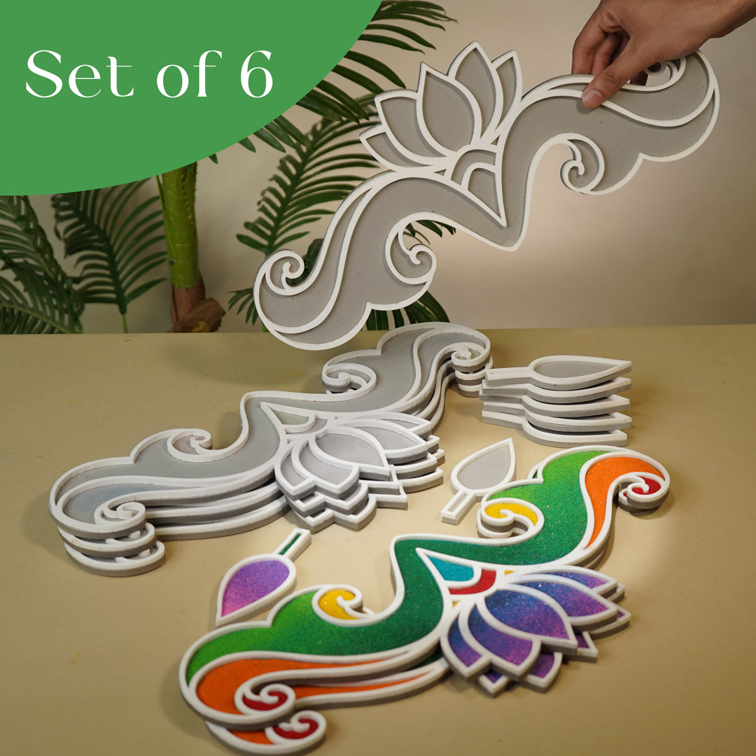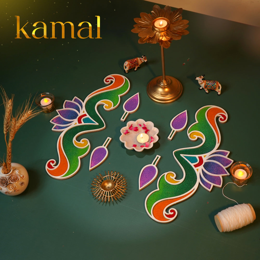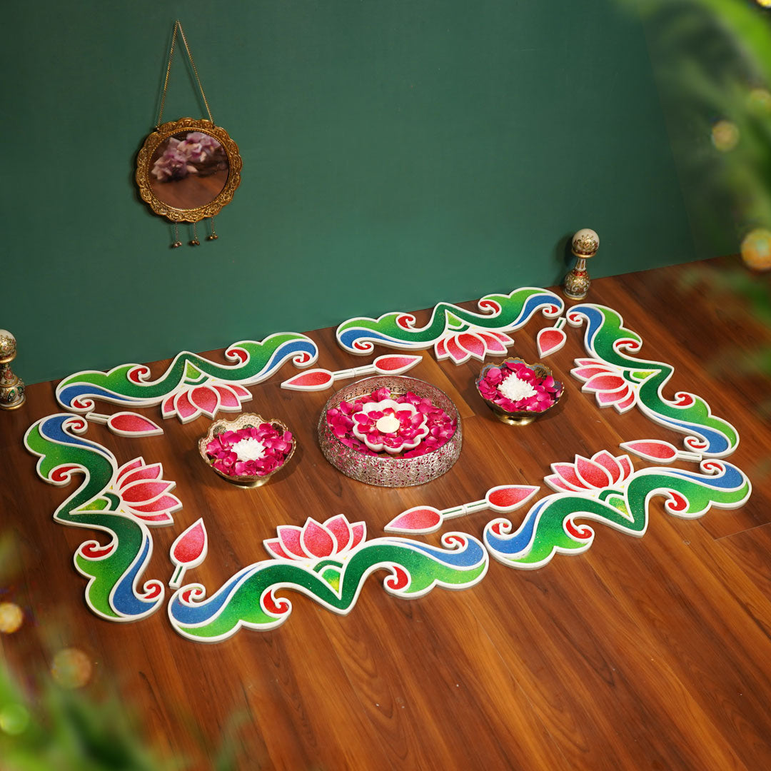 Simply place the template on any flat surface and fill the cut-outs with rangoli colours, petals, powdered spices, pulses, etc. You can use them as table centrepieces, candle or diffuser bases, deity pads, or welcome rangolis. They’re perfect for urli bowls and even poolside decor too.