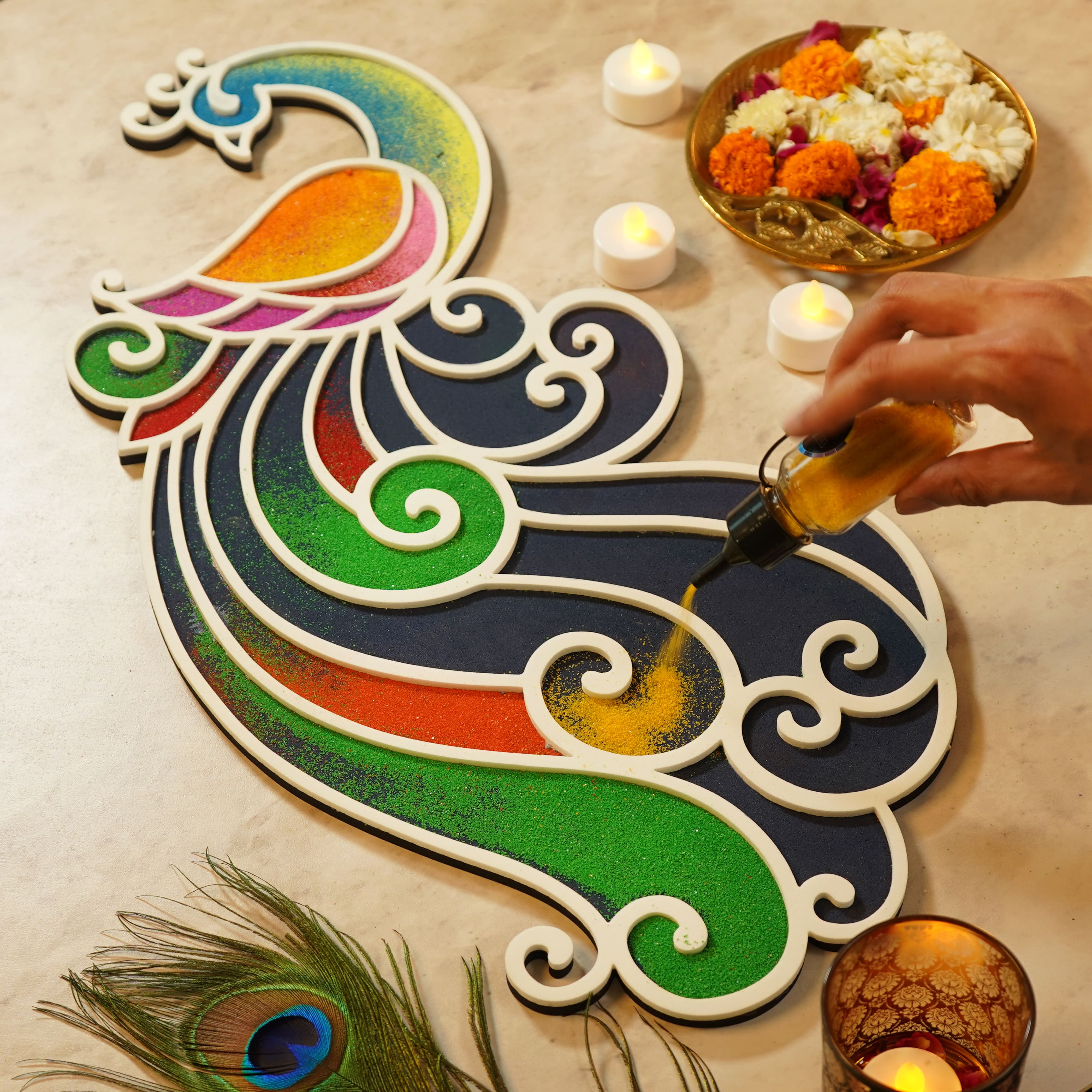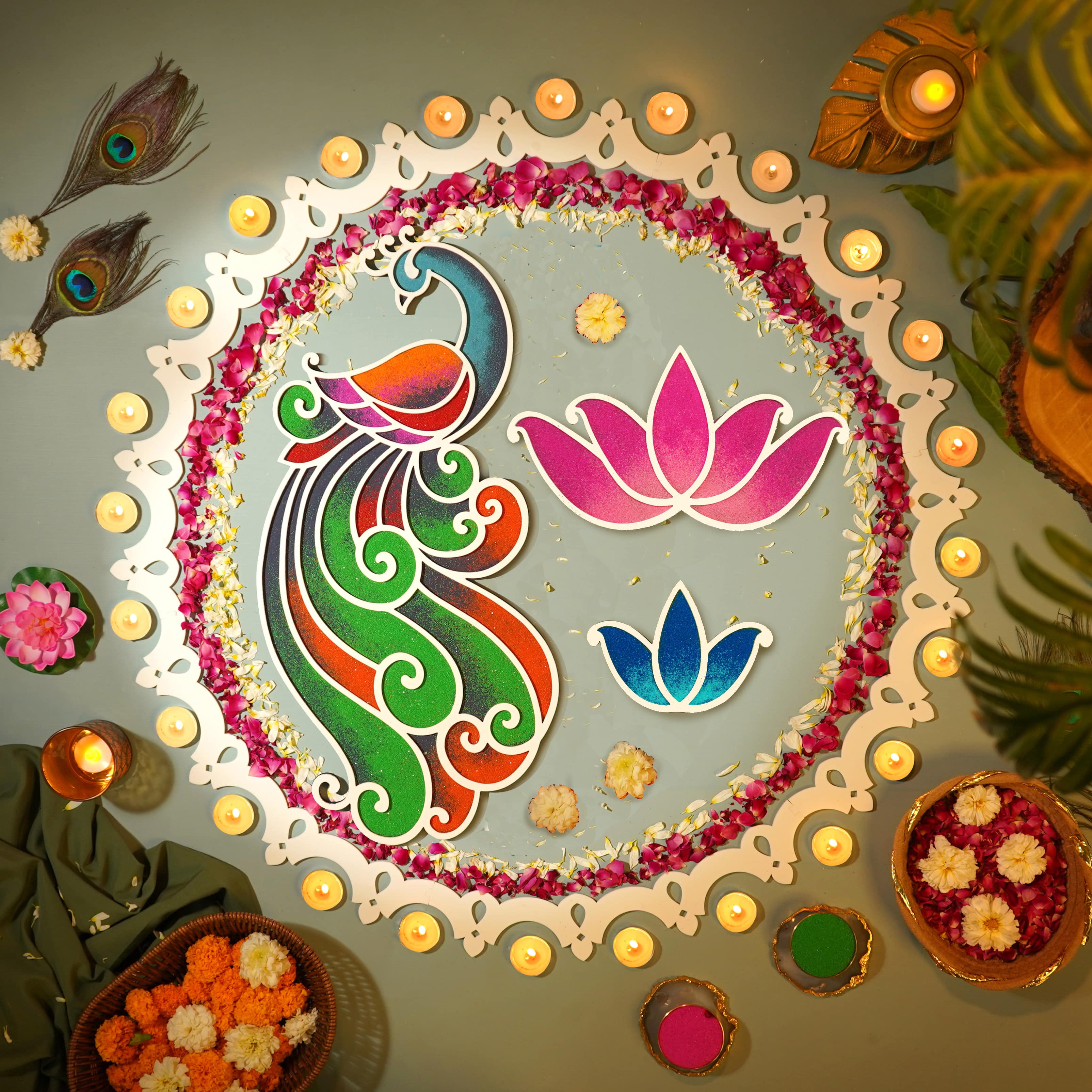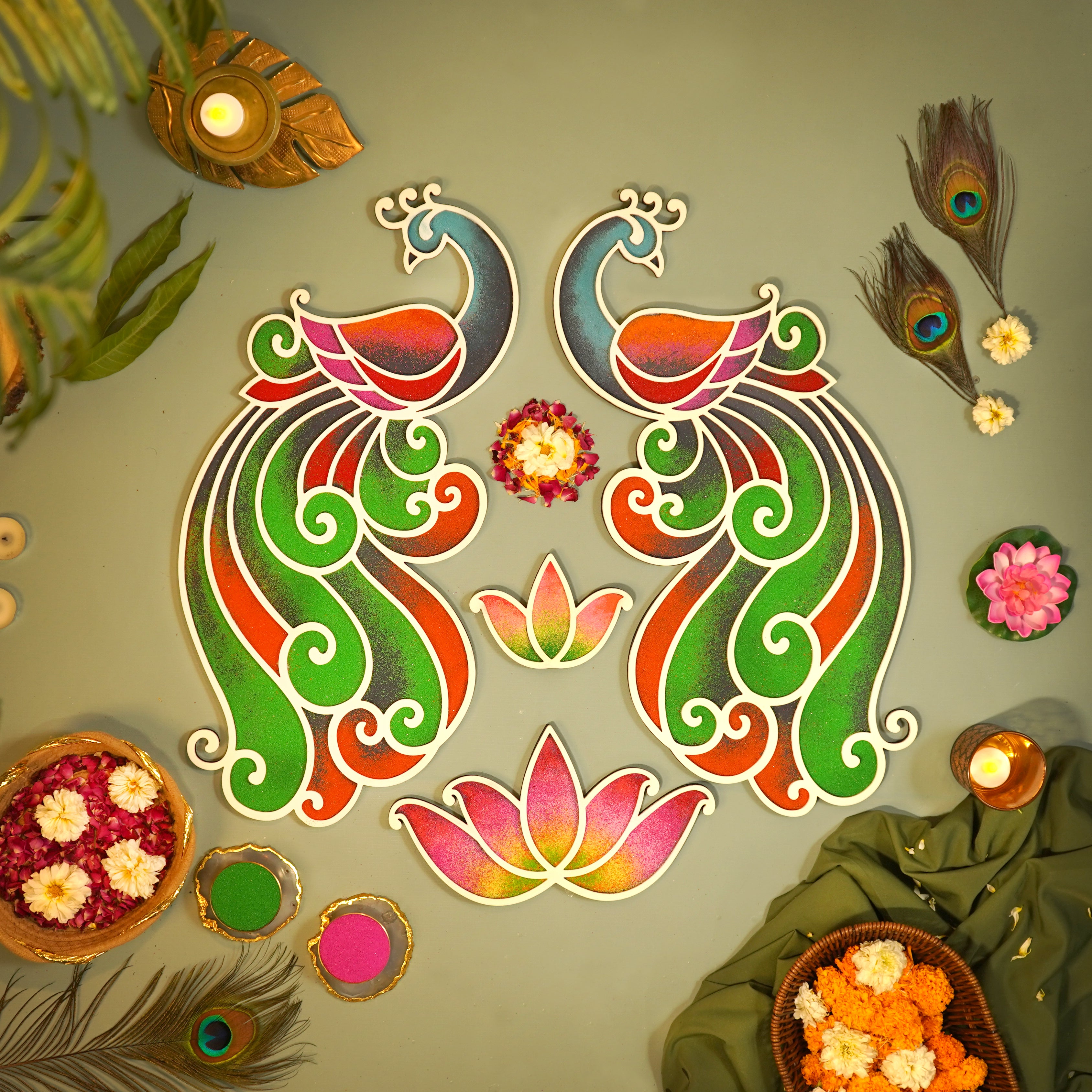 Celebrate the spirit of tradition with Island Rangoli’s most loved Mayur design. Now available in 5 exquisite designs . Bring the majestic beauty of the peacock to life in your festive décor with the beautiful Mayur Collection. Its graceful curves, feather details, and symmetrical layout make creating a stunning rangoli effortless, even for beginners. Create stunning patterns and combos from Rangvansh colors which are more suitable to use with Island Rangoli Templates