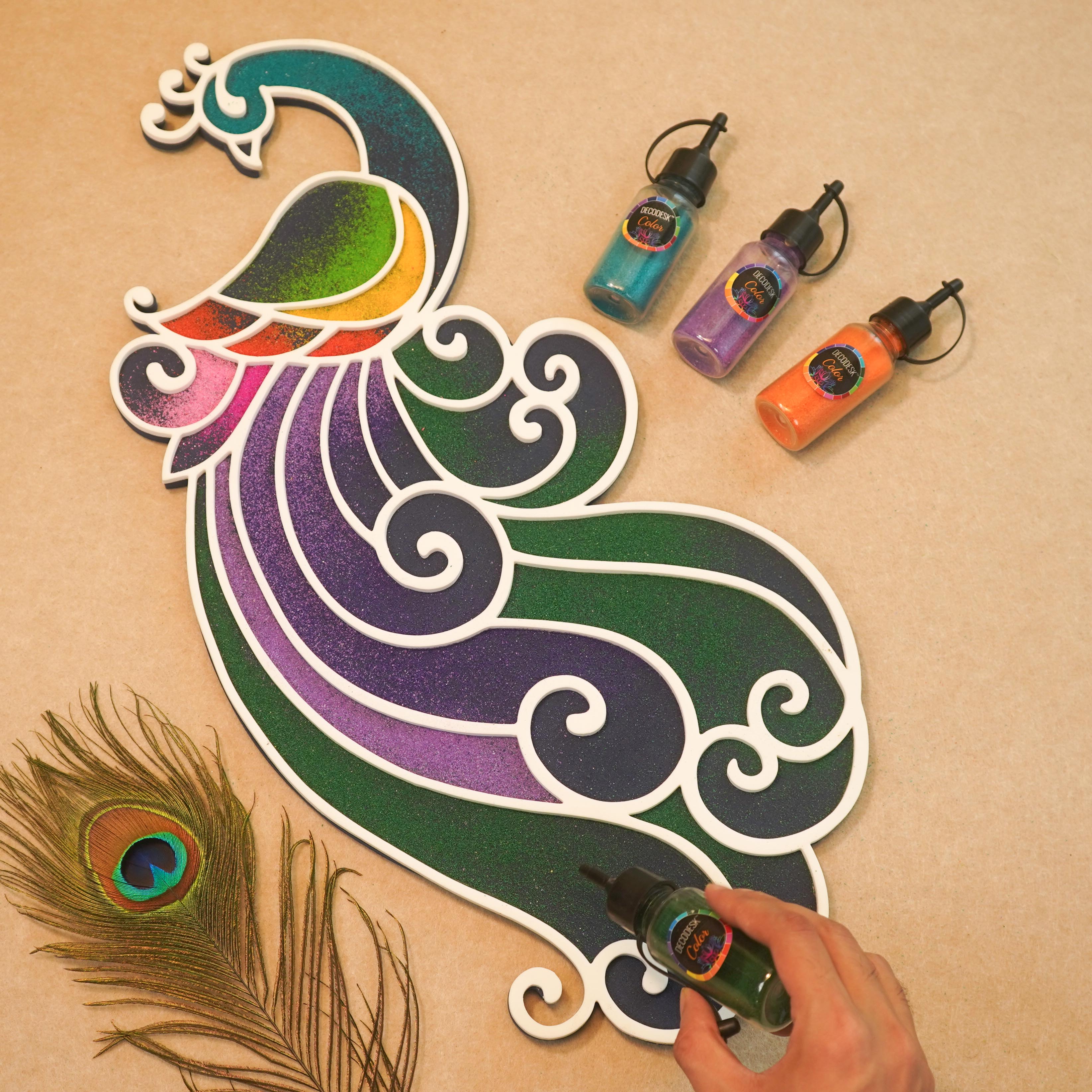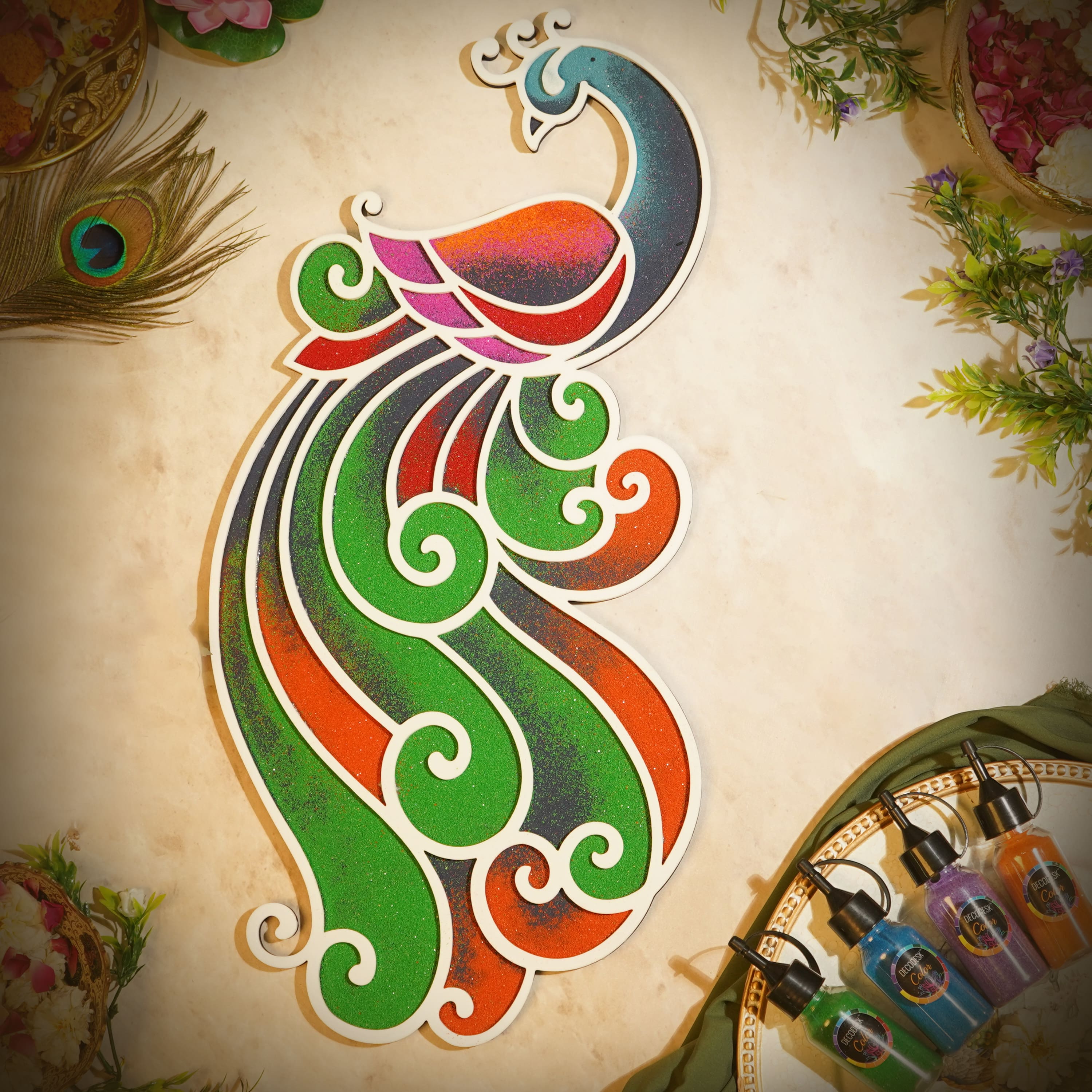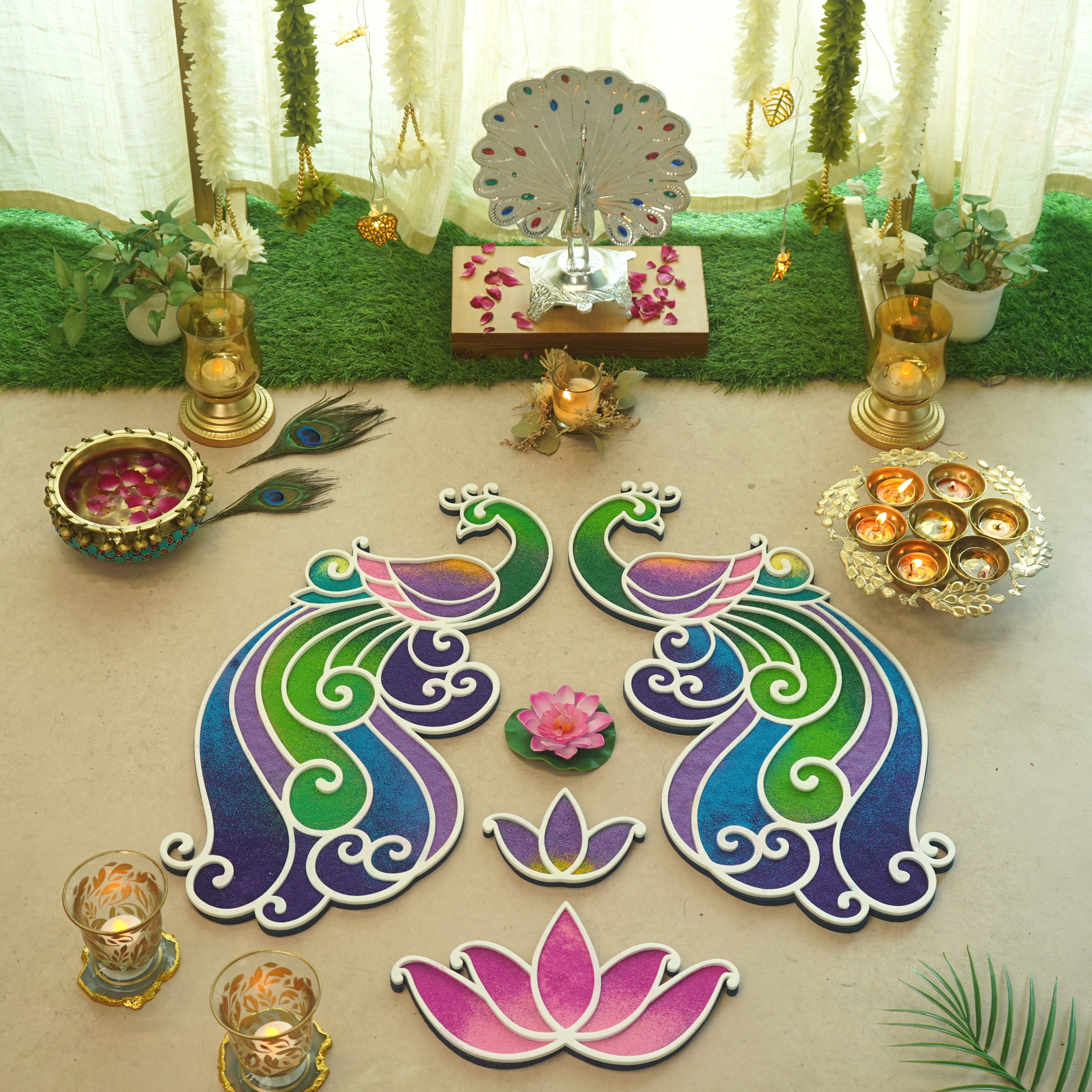 Celebrate the spirit of tradition with Island Rangoli’s most loved Mayur design. Now available in 5 exquisite designs . Bring the majestic beauty of the peacock to life in your festive décor with the beautiful Mayur Collection. Its graceful curves, feather details, and symmetrical layout make creating a stunning rangoli effortless, even for beginners. Create stunning patterns and combos from Rangvansh colors which are more suitable to use with Island Rangoli Templates