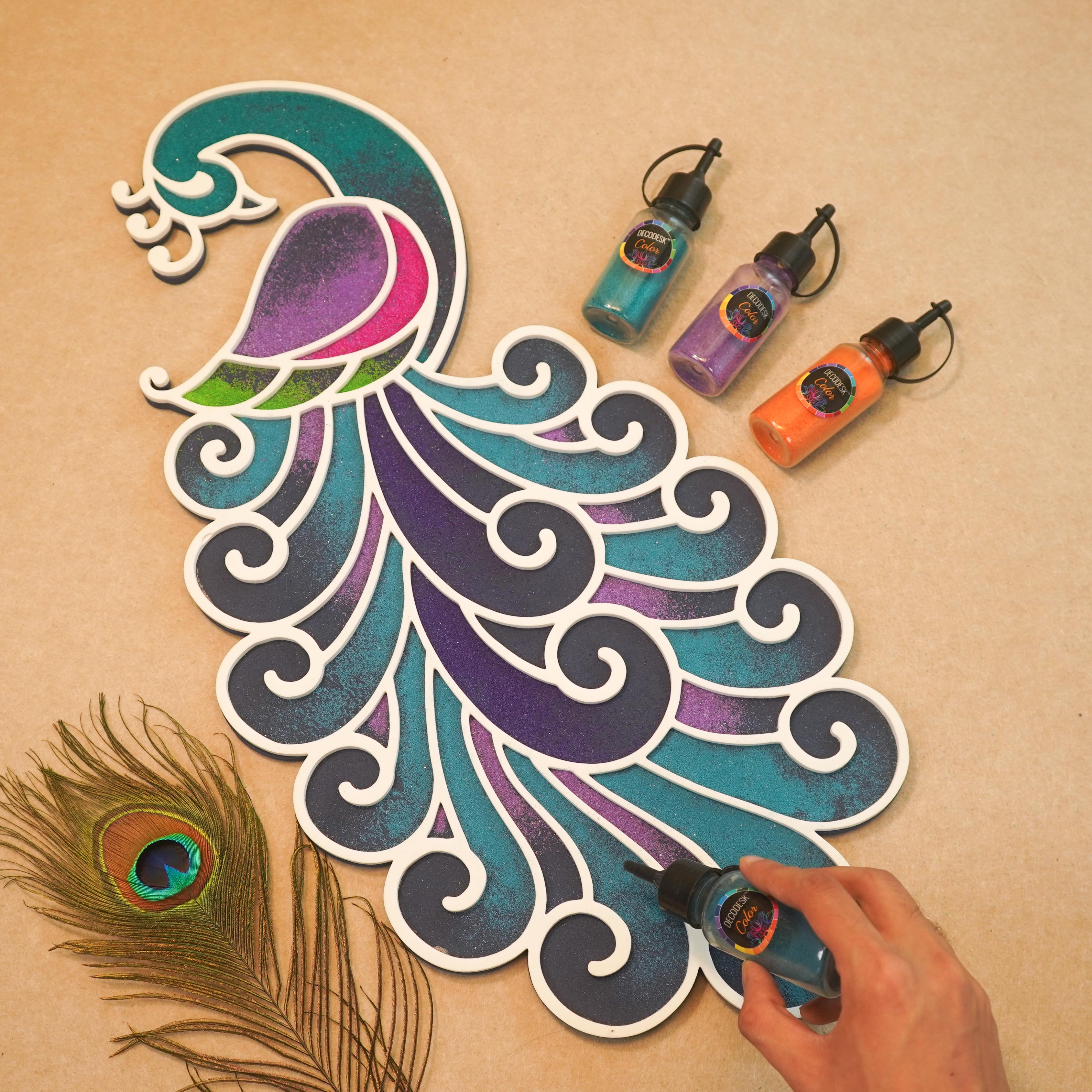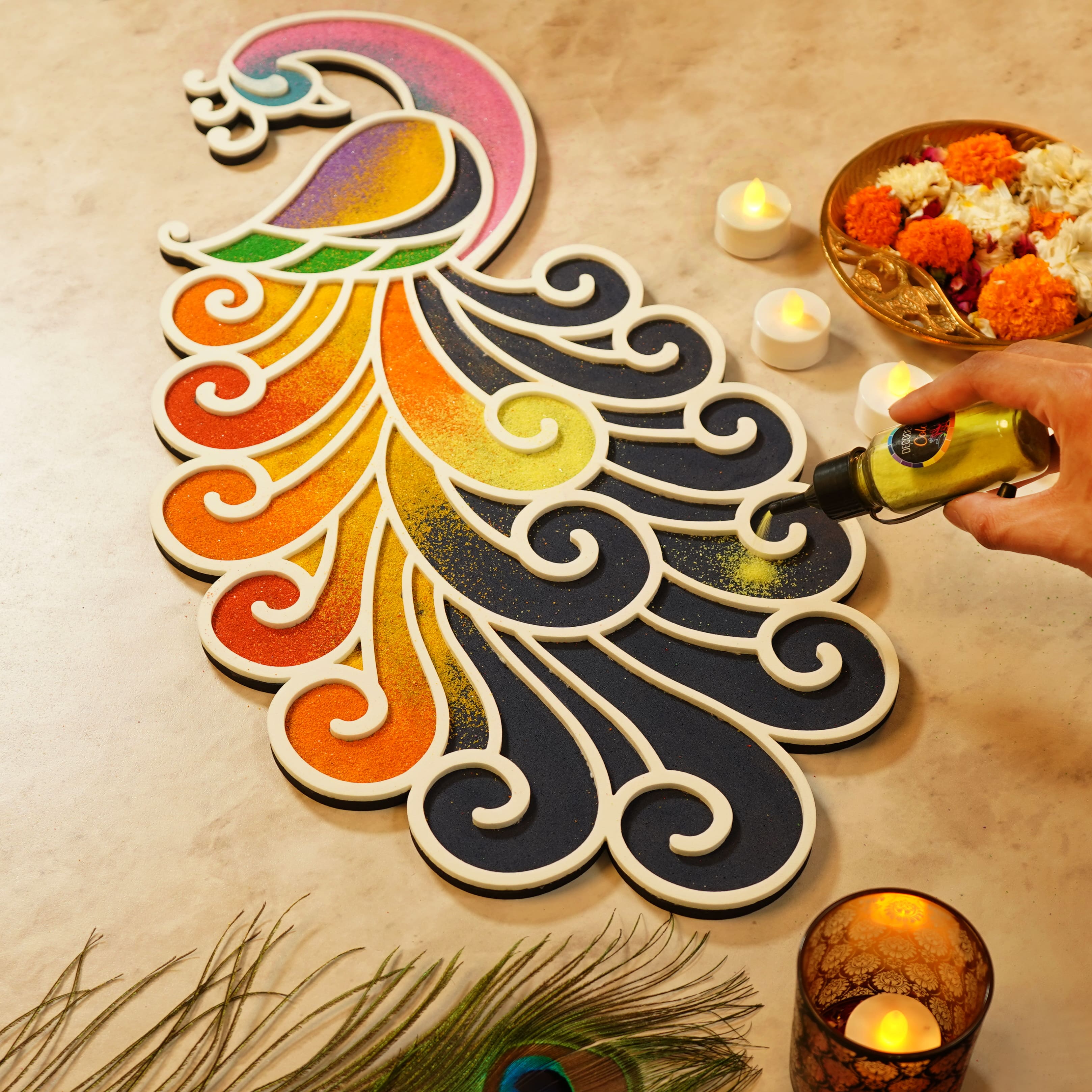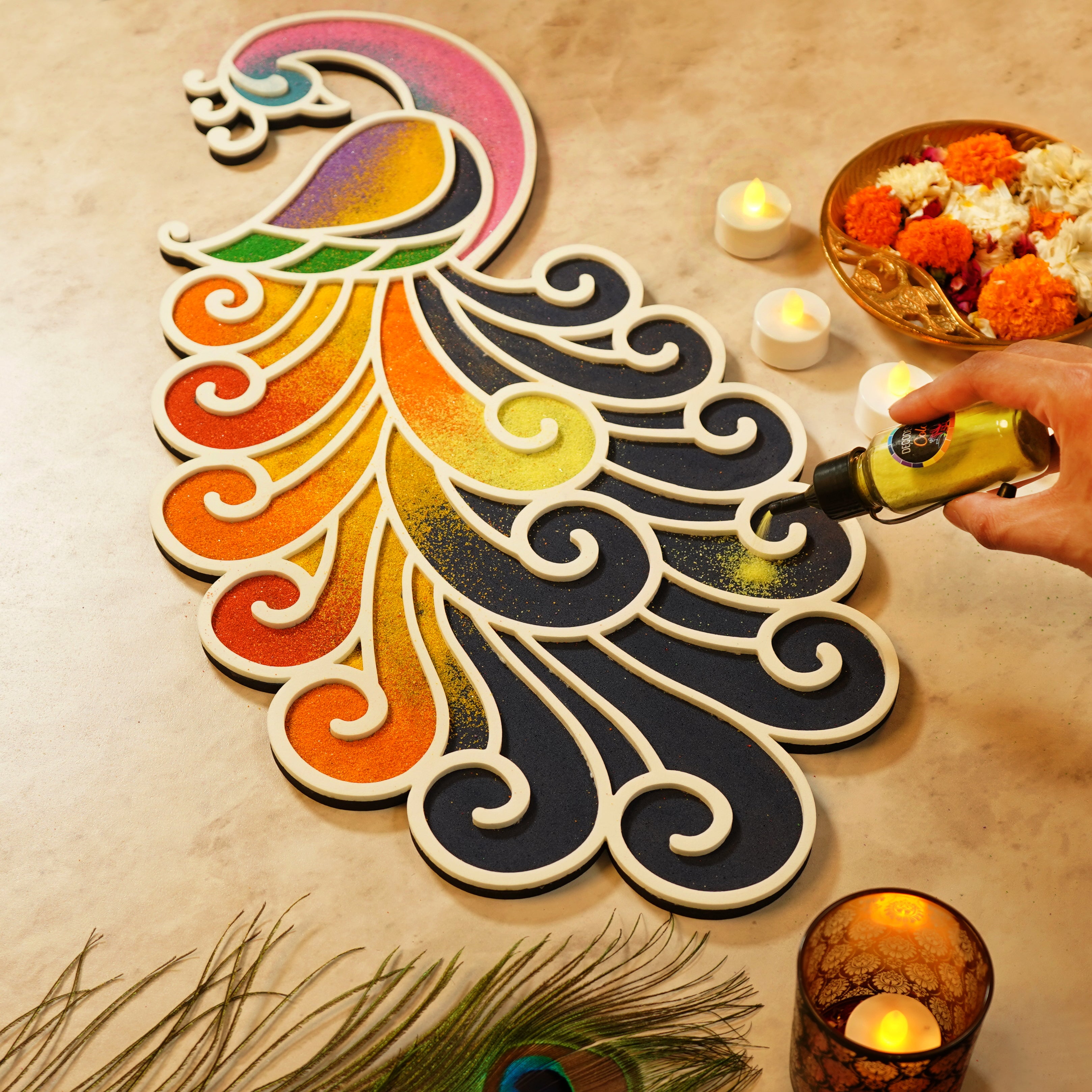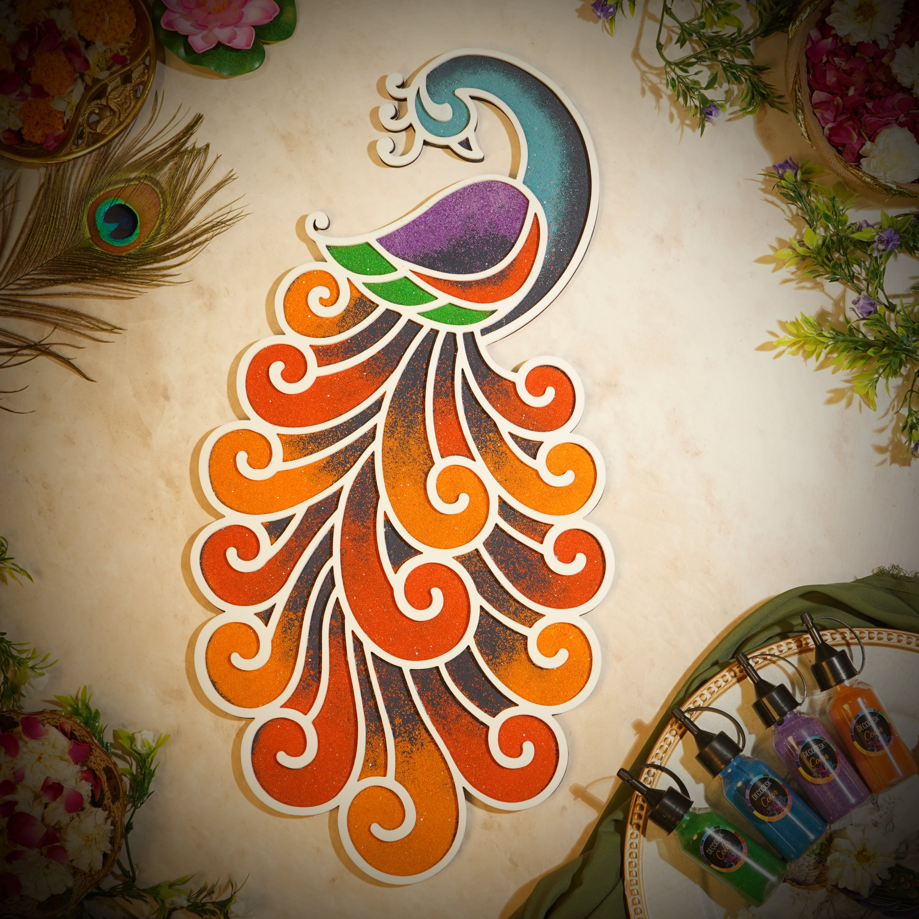 Celebrate the spirit of tradition with Island Rangoli’s most loved Mayur design. Now available in 5 exquisite designs . Bring the majestic beauty of the peacock to life in your festive décor with the beautiful Mayur Collection. Its graceful curves, feather details, and symmetrical layout make creating a stunning rangoli effortless, even for beginners. Create stunning patterns and combos from Rangvansh colors which are more suitable to use with Island Rangoli Templates