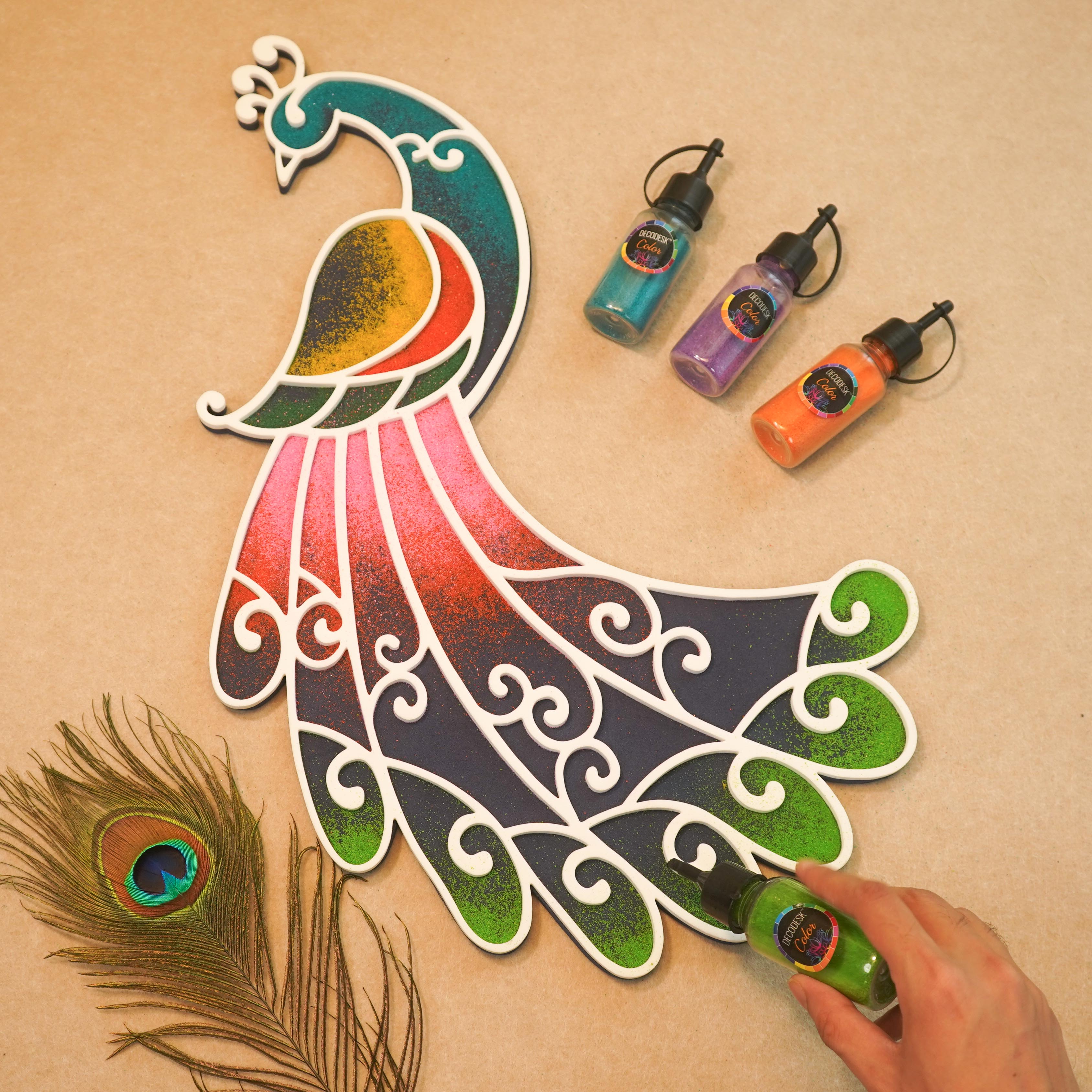 Celebrate the spirit of tradition with Island Rangoli’s most loved Mayur design. Now available in 5 exquisite designs . Bring the majestic beauty of the peacock to life in your festive décor with the beautiful Mayur Collection. Its graceful curves, feather details, and symmetrical layout make creating a stunning rangoli effortless, even for beginners. Create stunning patterns and combos from Rangvansh colors which are more suitable to use with Island Rangoli Templates.