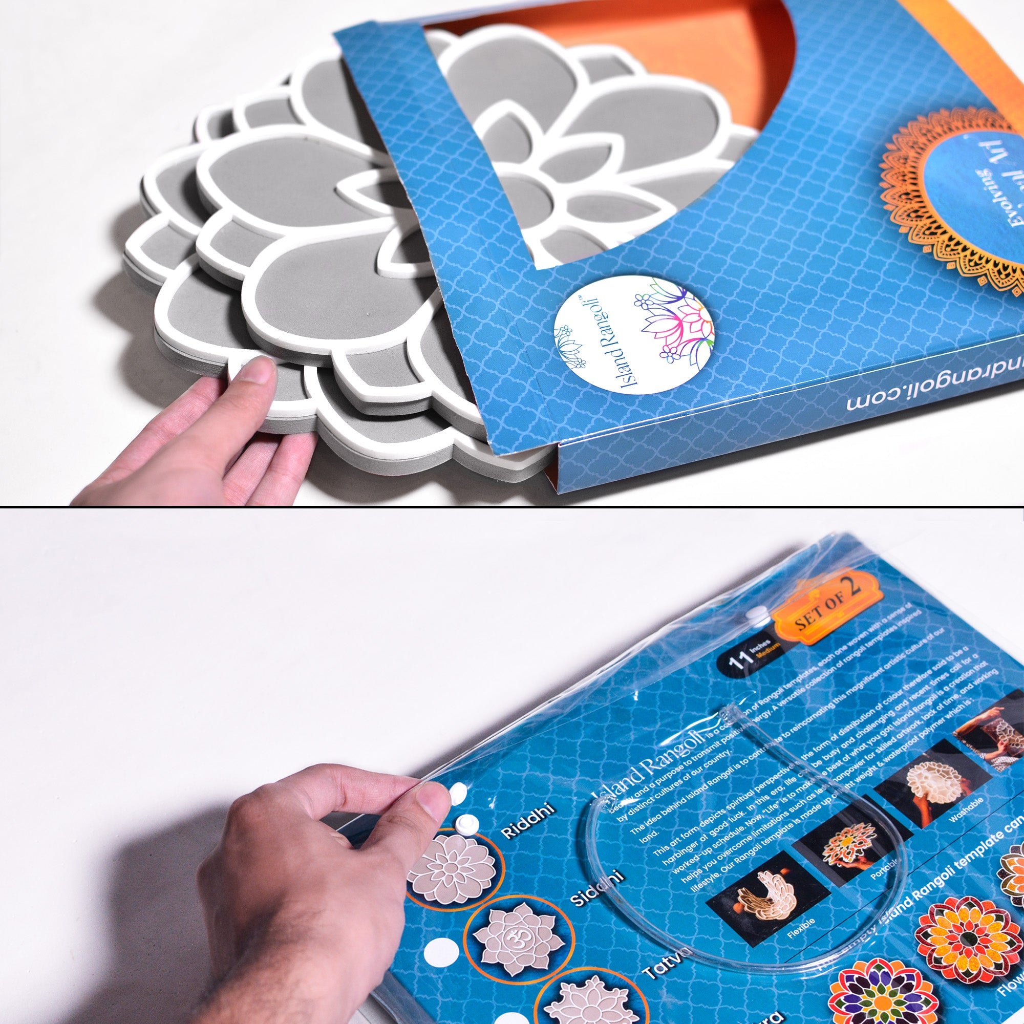 Portable: The template allows the everyone to fill rangoli in their comfort space and then place it on your desired space.Lightweight & Easy to clean:Island Rangoli can be placed anywhere and on any surface like floor, furniture, water, walls and garden. It can be washed easily OR you can dry dust Using Spade spoon` and brush to remove previous fillings and make it ready for next use and Storage.Easy to make: Island Rangolis allows you in making a hassle and mess-free rangoli. Make it wherever and whenever you want in your comfort zone, without having to flesh out countless hours.Placements: Place the template at the desired space of your home/office such floor, garden, table top, stairs etc. Decorate with your Preferential ingredients like Colors, Pulses, Flowers, acrylic colours or SpicesCan be Floated: Island Rangoli is first kind of rangoli in the world that can be floated on water which eventually enhances the beautification of this art. Adorn your space with this rangoli and seek compliments from your loved ones