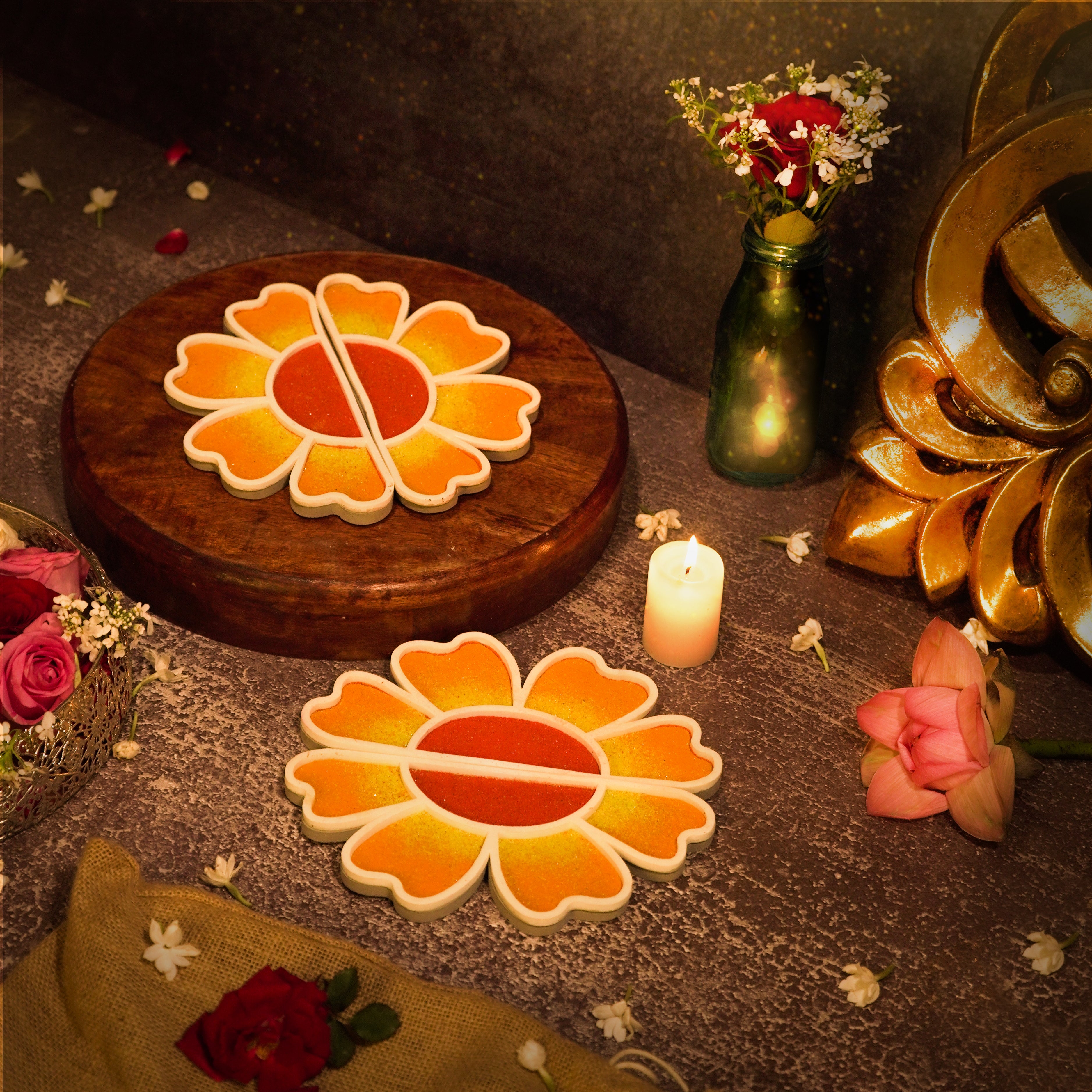 Simply place the template on any flat surface and fill the cut-outs with rangoli colours, petals, powdered spices, pulses, etc. You can use them as table centrepieces, candle or diffuser bases, deity pads, or welcome rangolis. They’re perfect for urli bowls and even poolside decor too.